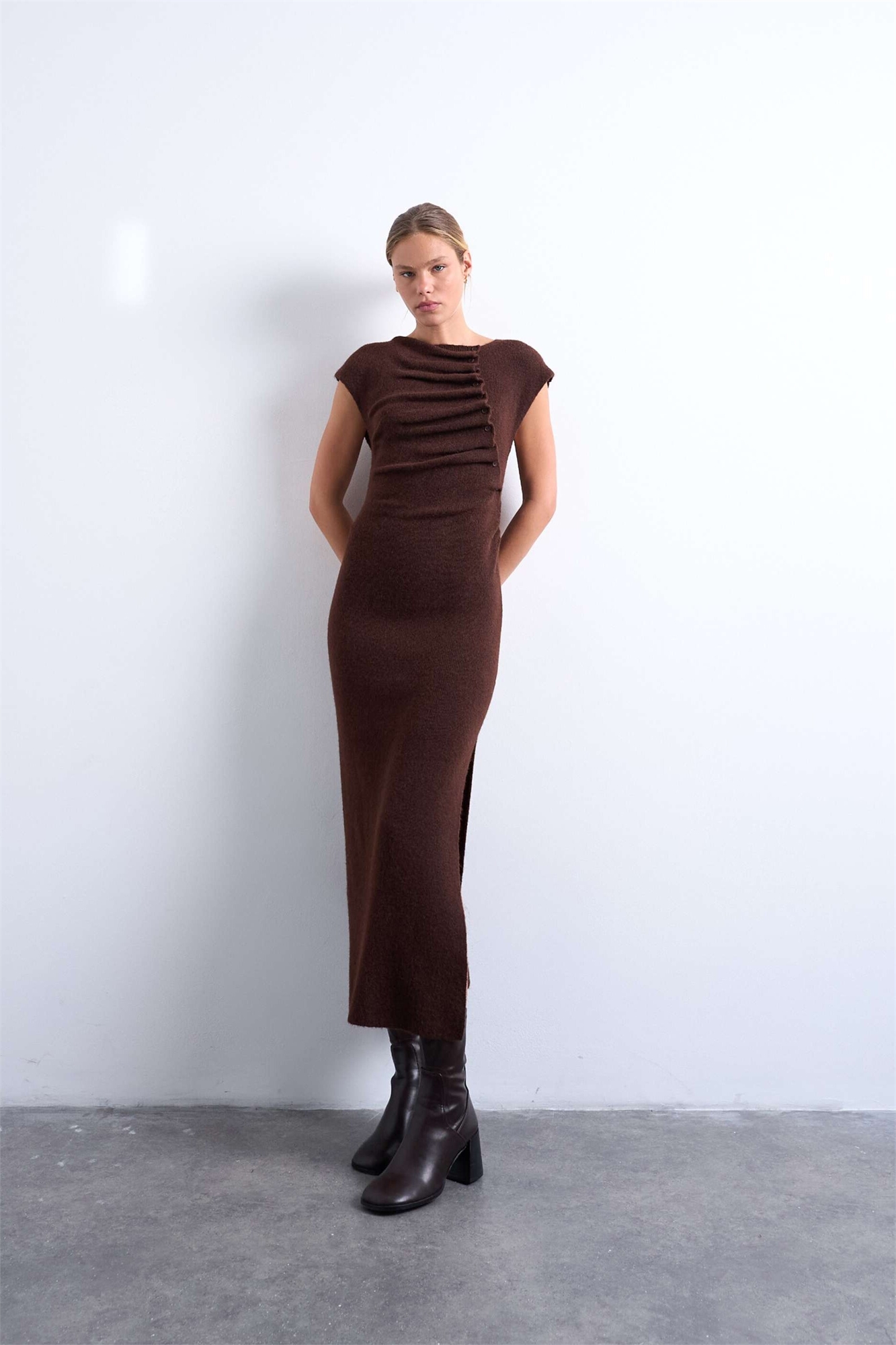 Асимметричное платье из трикотажа с оборками и пуговицами