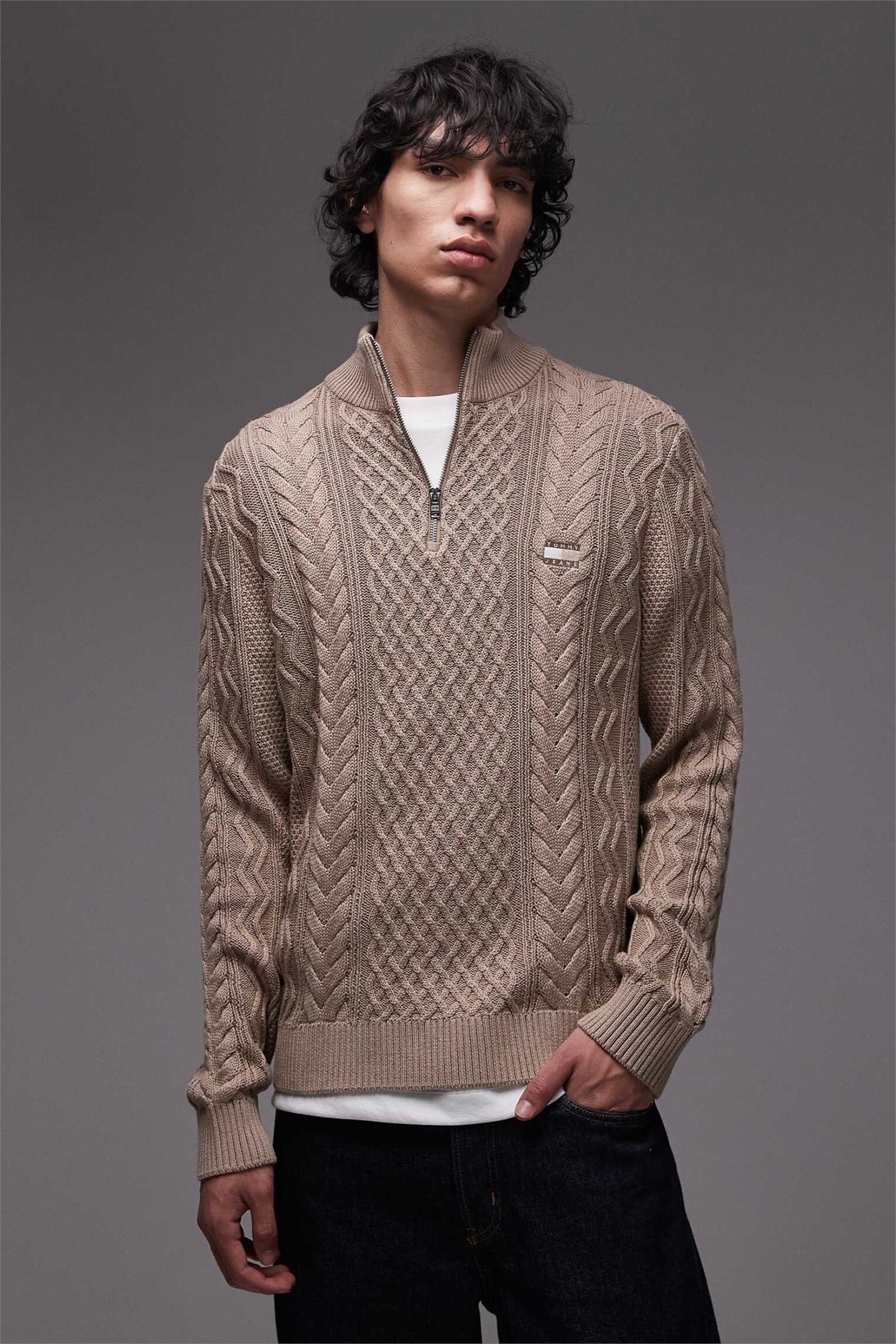 Свитер с тонким узором «коса» и застежкой-молнией на 1/4 длины