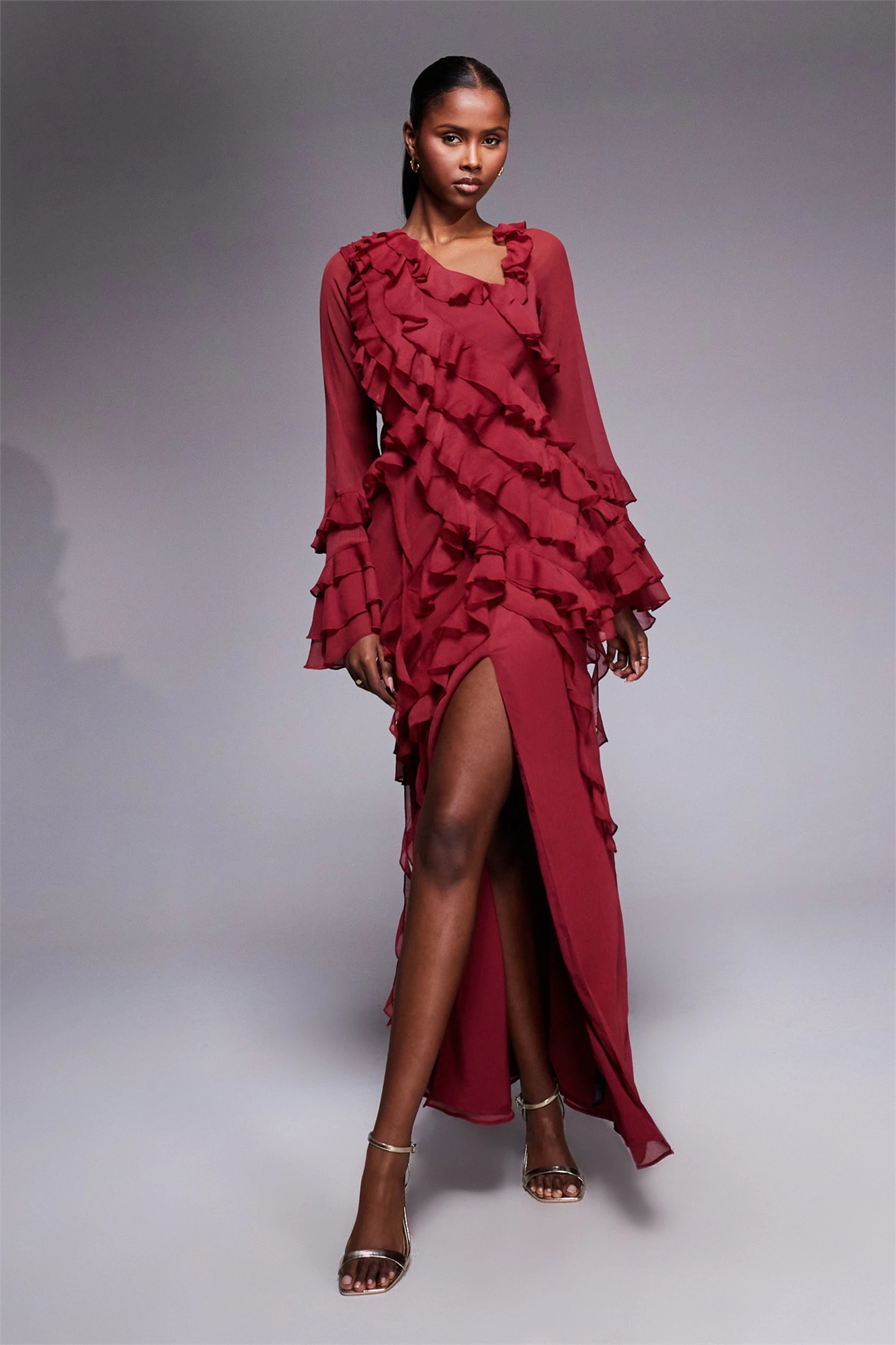 Макси-платье из шифона с длинными рукавами, асимметричным кроем, мягкими оборками и многослойным силуэтом