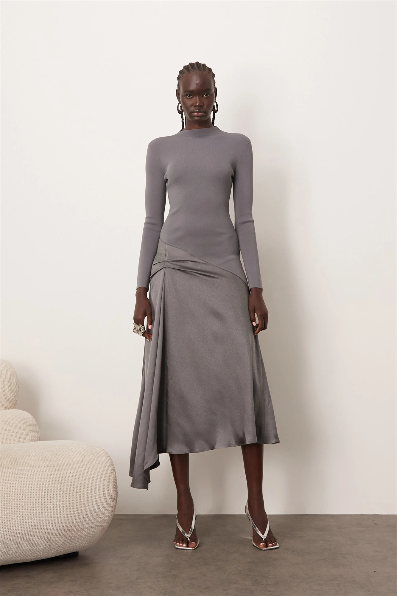 Платье средней длины из гибридного трикотажа с длинными рукавами