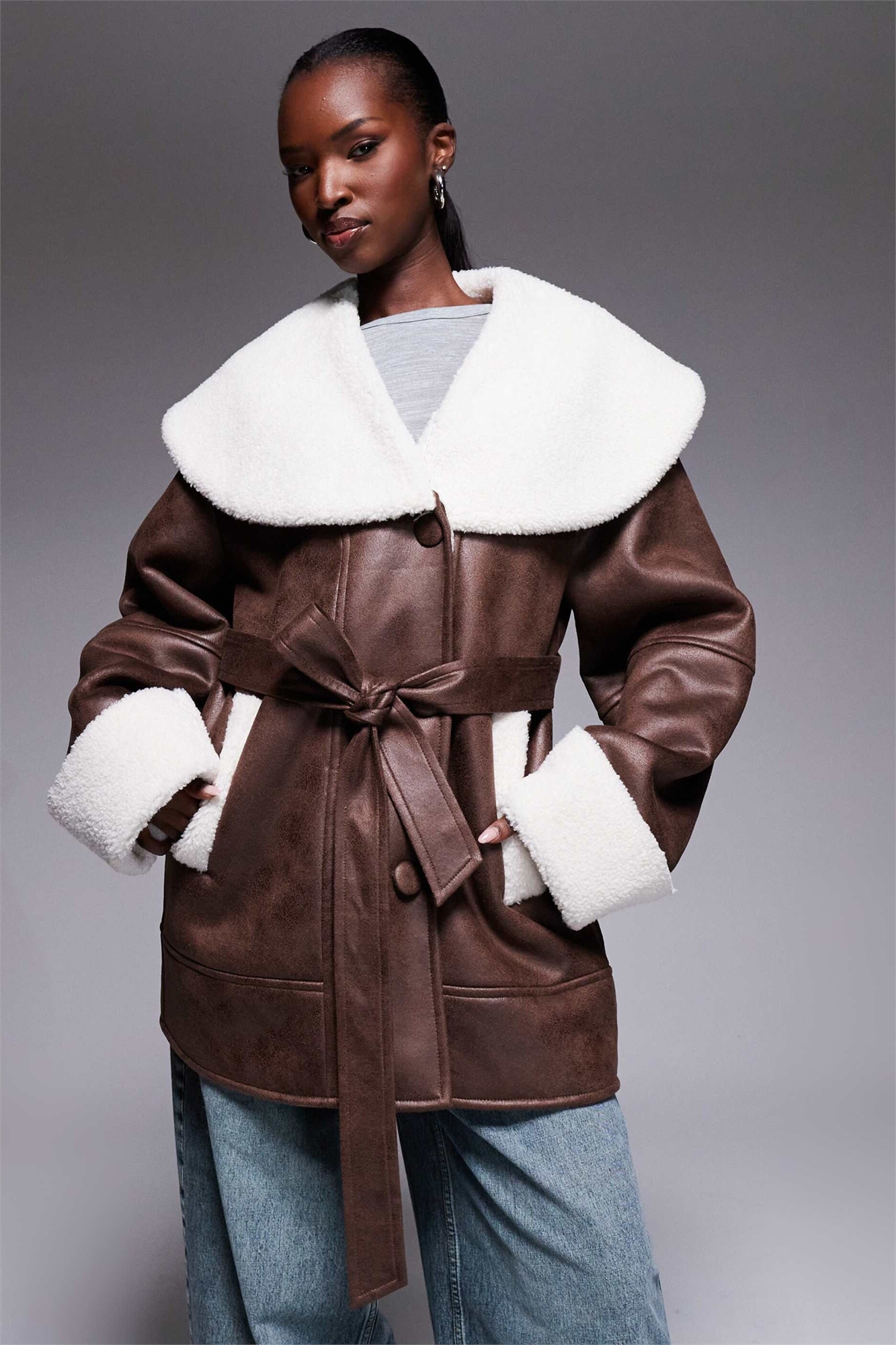 Эксклюзивное пальто с поясом из искусственной овчины и кремового борж