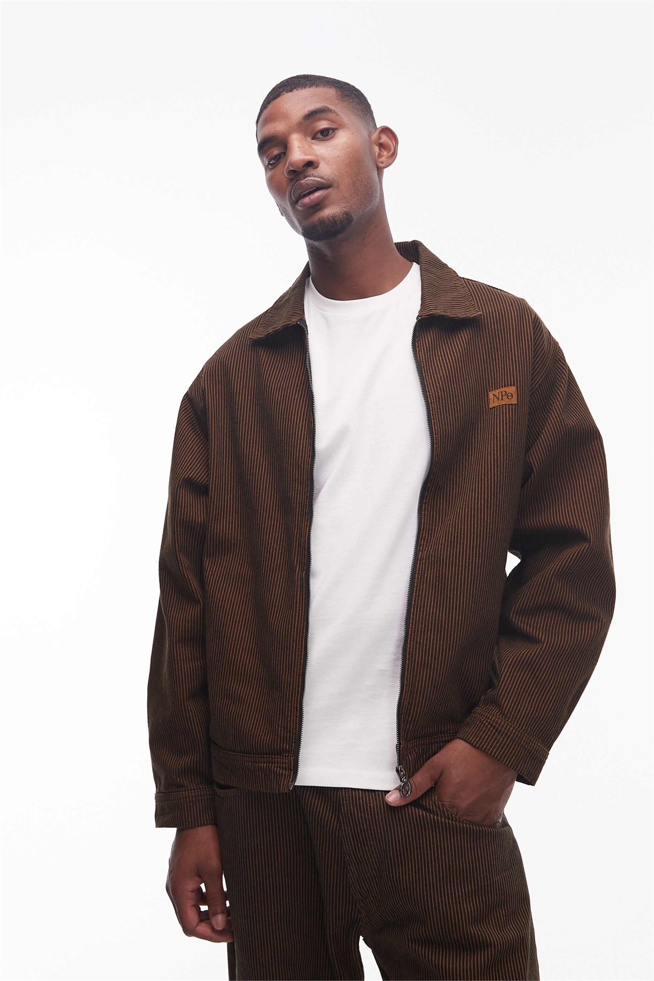 Найока, комплект из хлопковой куртки-харингтон с застежкой-молнией и брюк в коричневую полоску