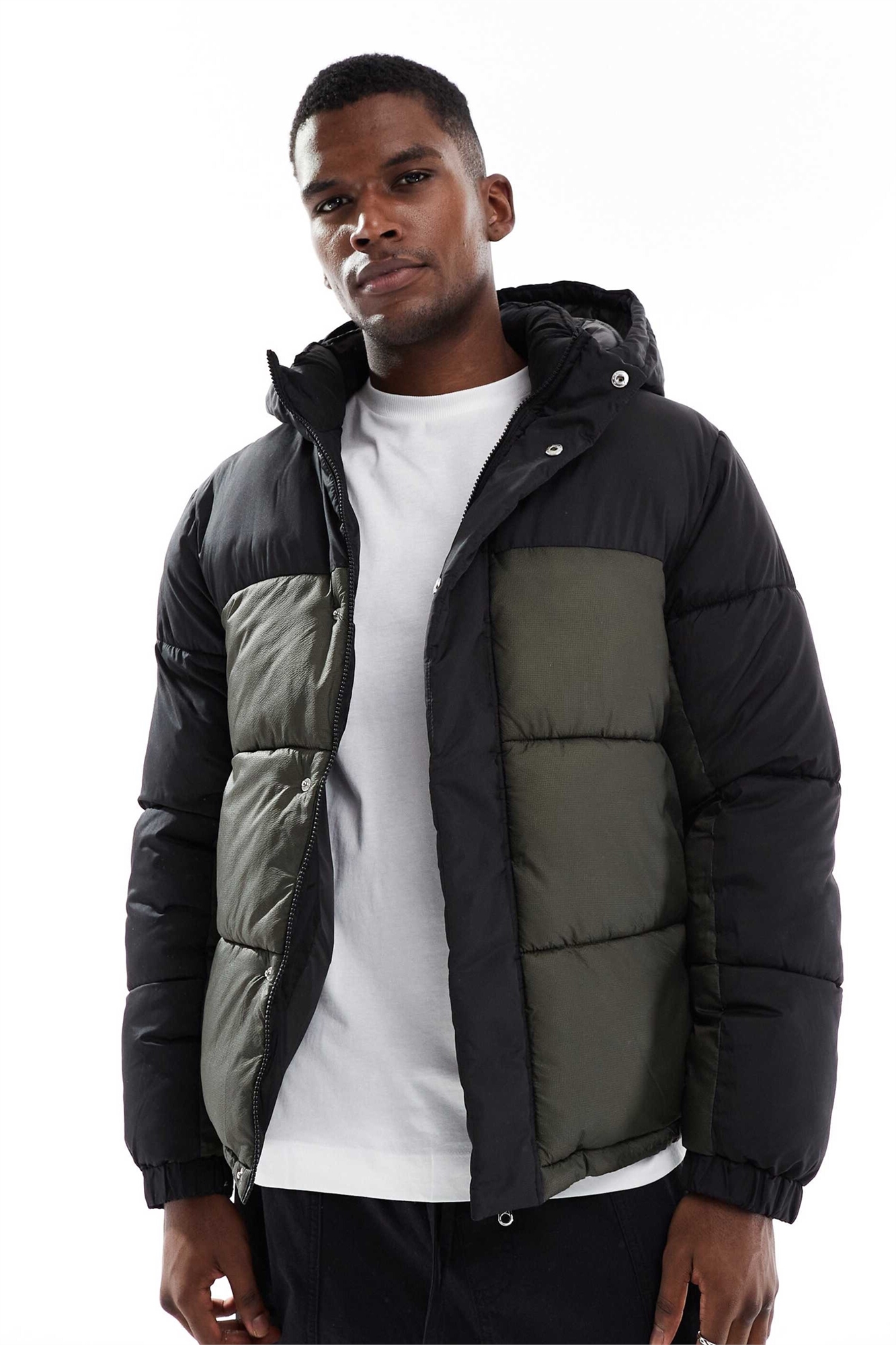 Пуховик с капюшоном и контрастными вставками