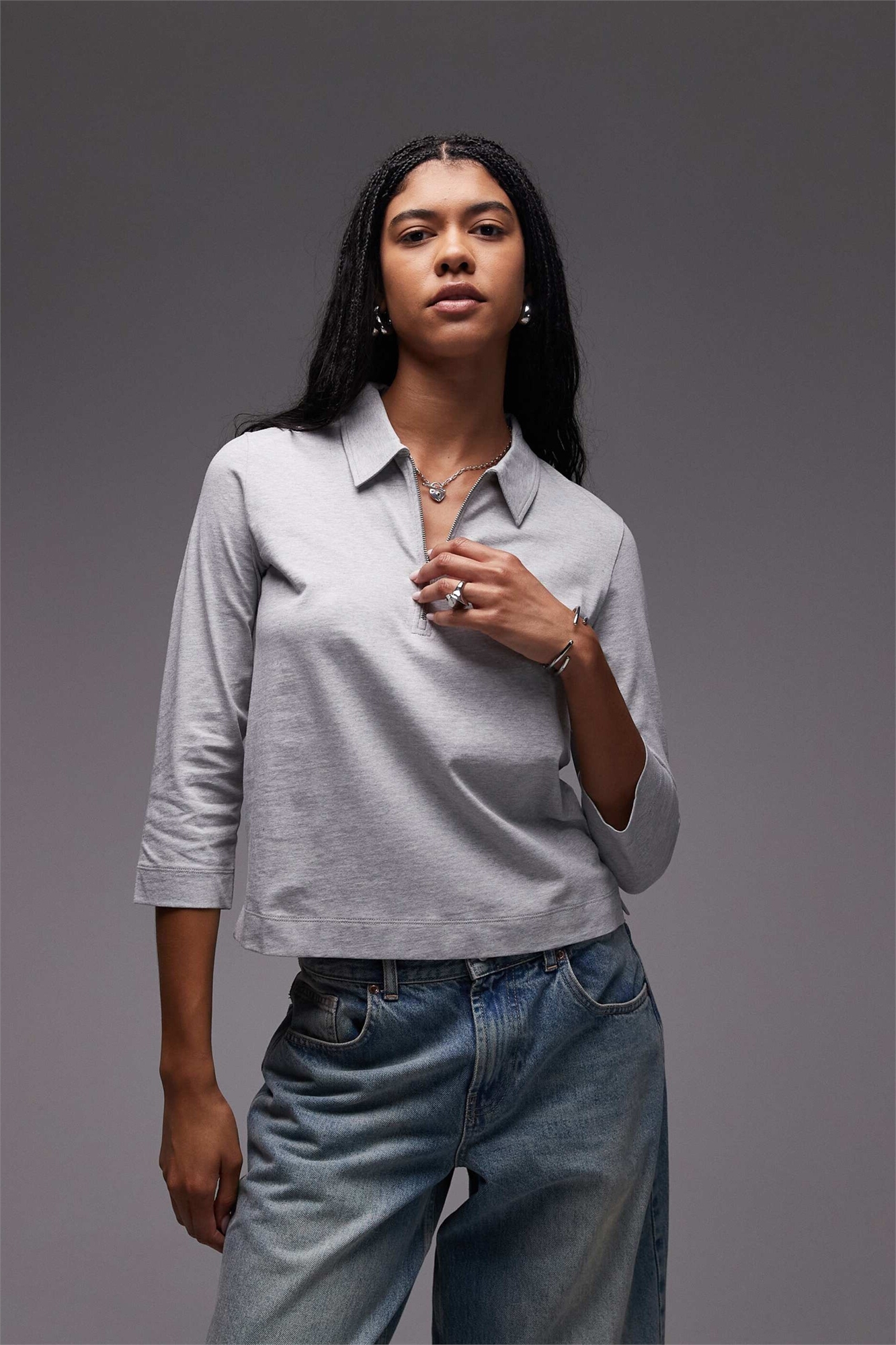 Поло из трикотажа с ребристой отделкой, воротником на молнии и рукавами длиной 3/4
