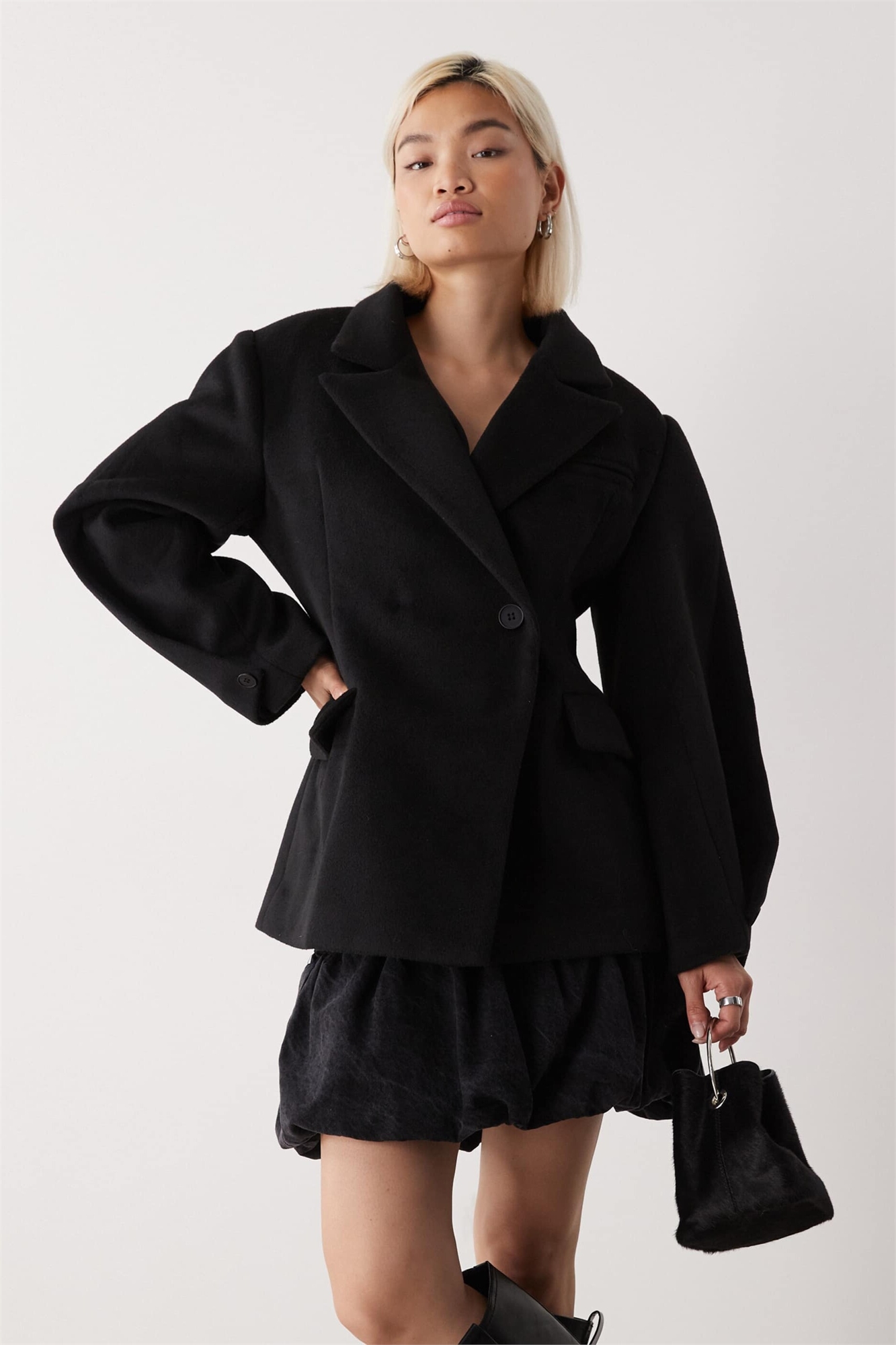 Двубортное пальто черного цвета с зауженной талией и рукавами-бочонками, из шерсти с эффектом «шерсть на ощупь»