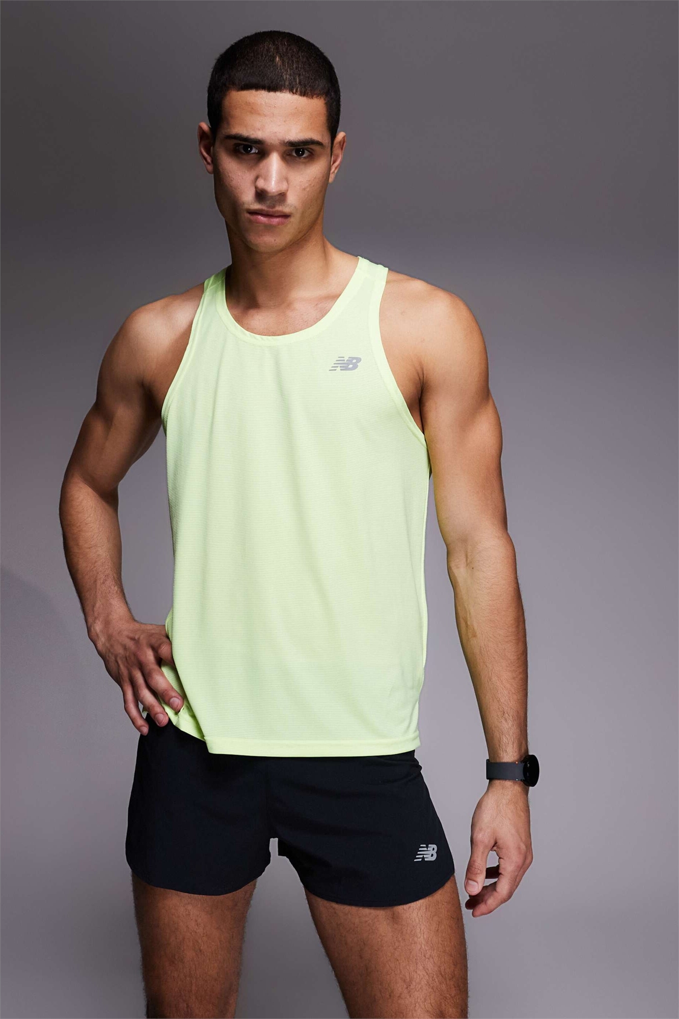 Эластичная ткань с простым переплетением Легкая и перфорированная Использует технологию New Balance Dry Отводит пот от кожи, вытягивая его из ткани, чтобы ускорить испарение Основной материал: 86% полиэстер, 14% спандекс.