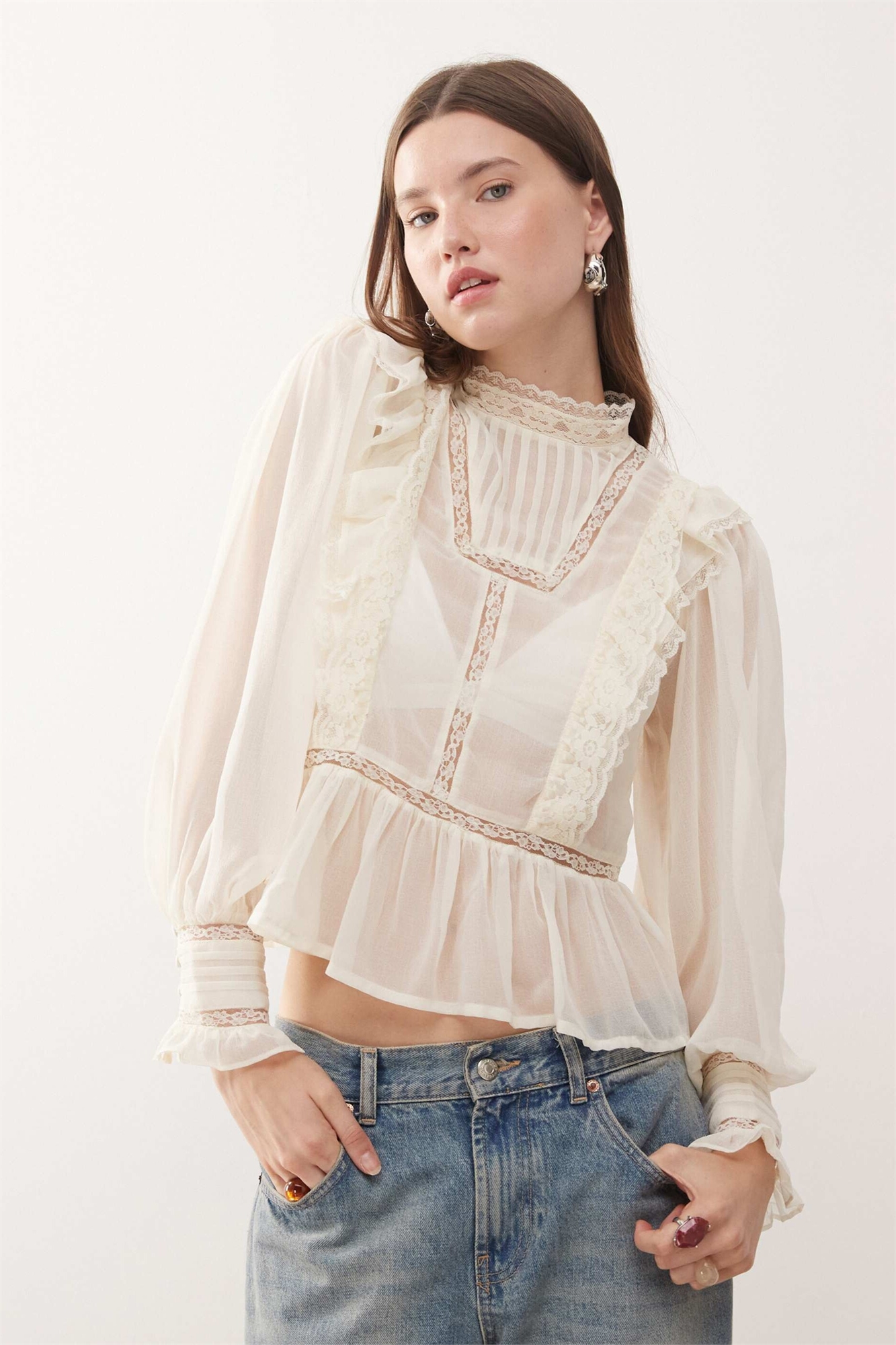 Прозрачный топ из чаевого полотна с вытачками и высоким воротником