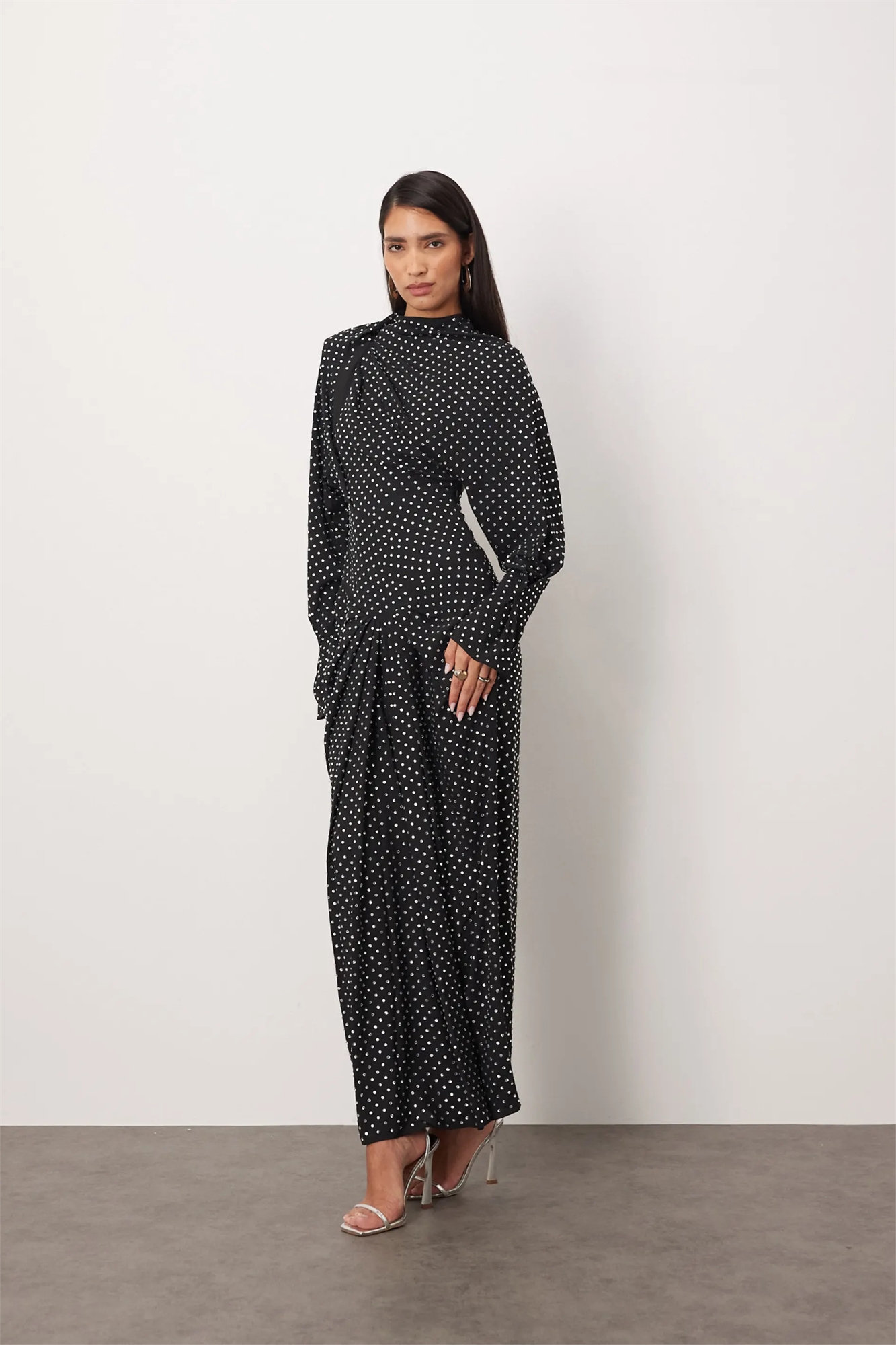 Макси-платье с драпированным вырезом, выразительными плечами и открытой спиной, украшенное стразами