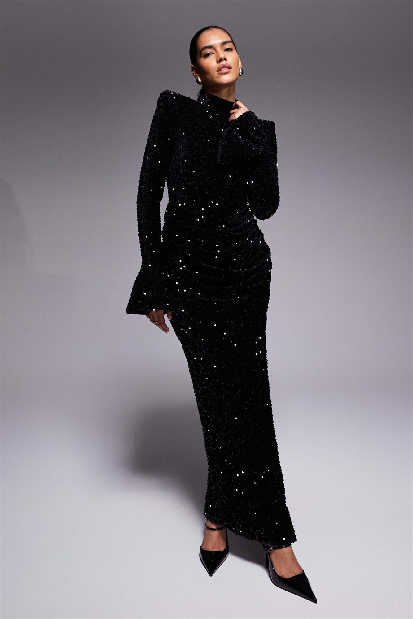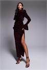 Бархатное макси-платье с пайетками и драпировкой на талии