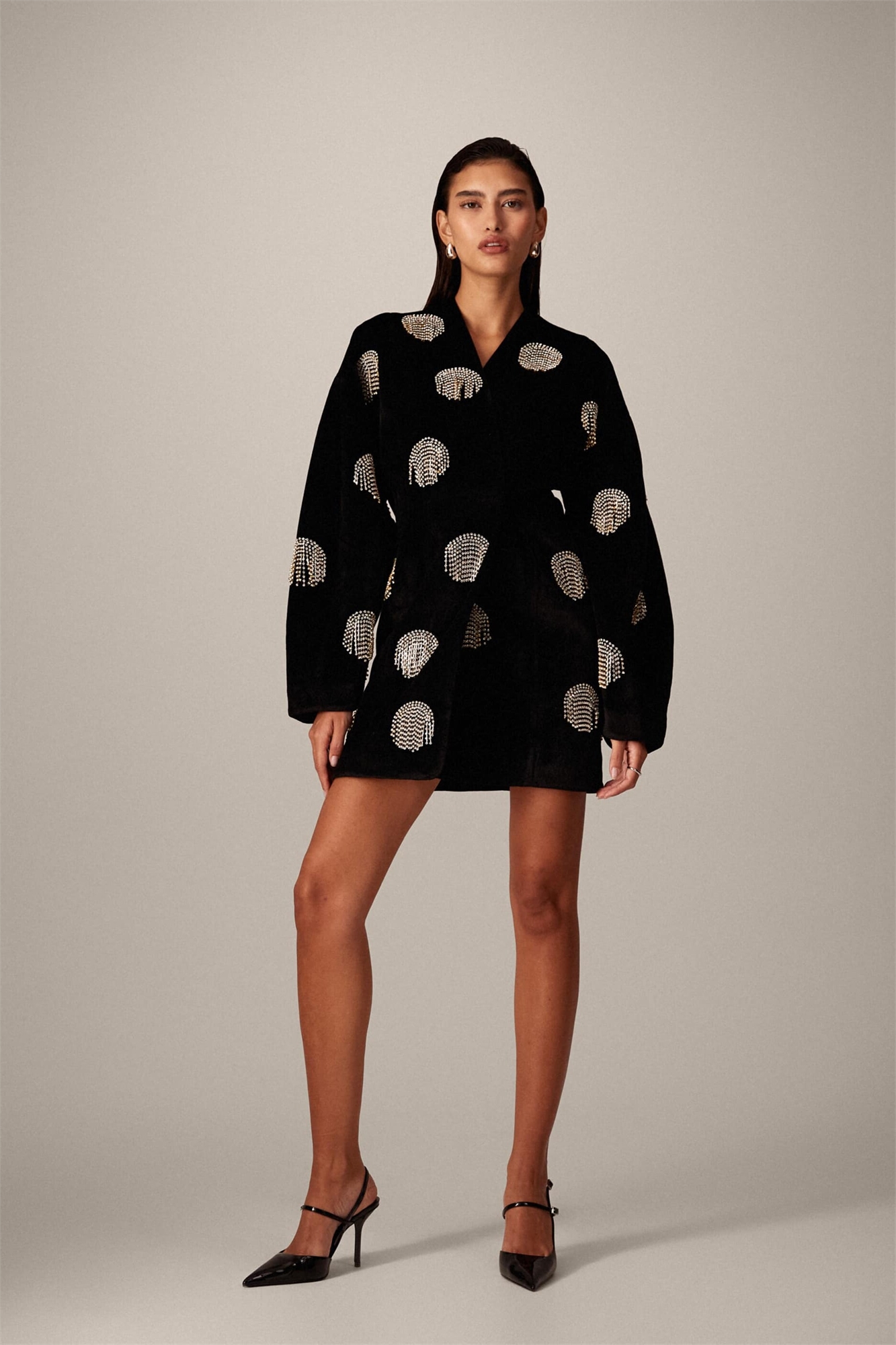 Мини-платье-халат из бархата с украшением в виде точек