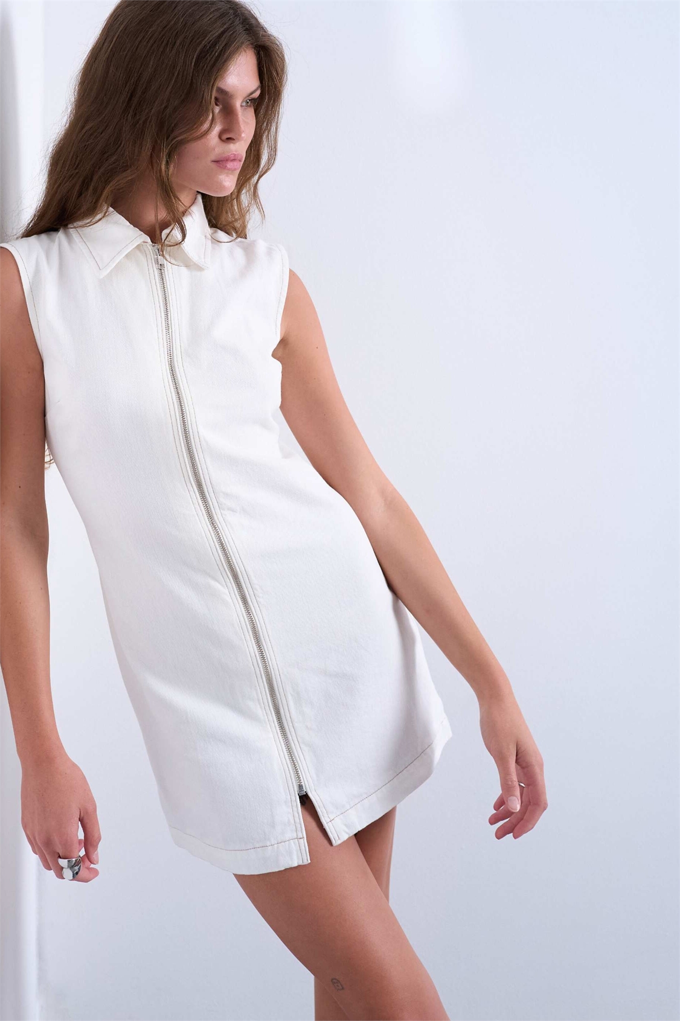 Мини-платье без рукавов из денима с воротником на молнии