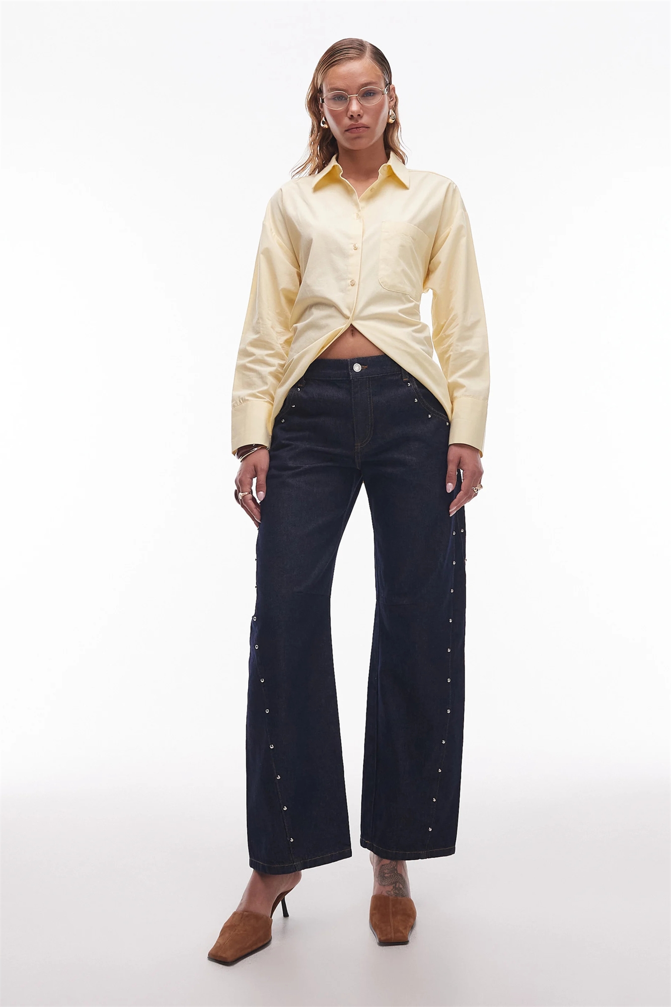 Джинсы с низкой посадкой и широкими брючинами, украшенные заклепками