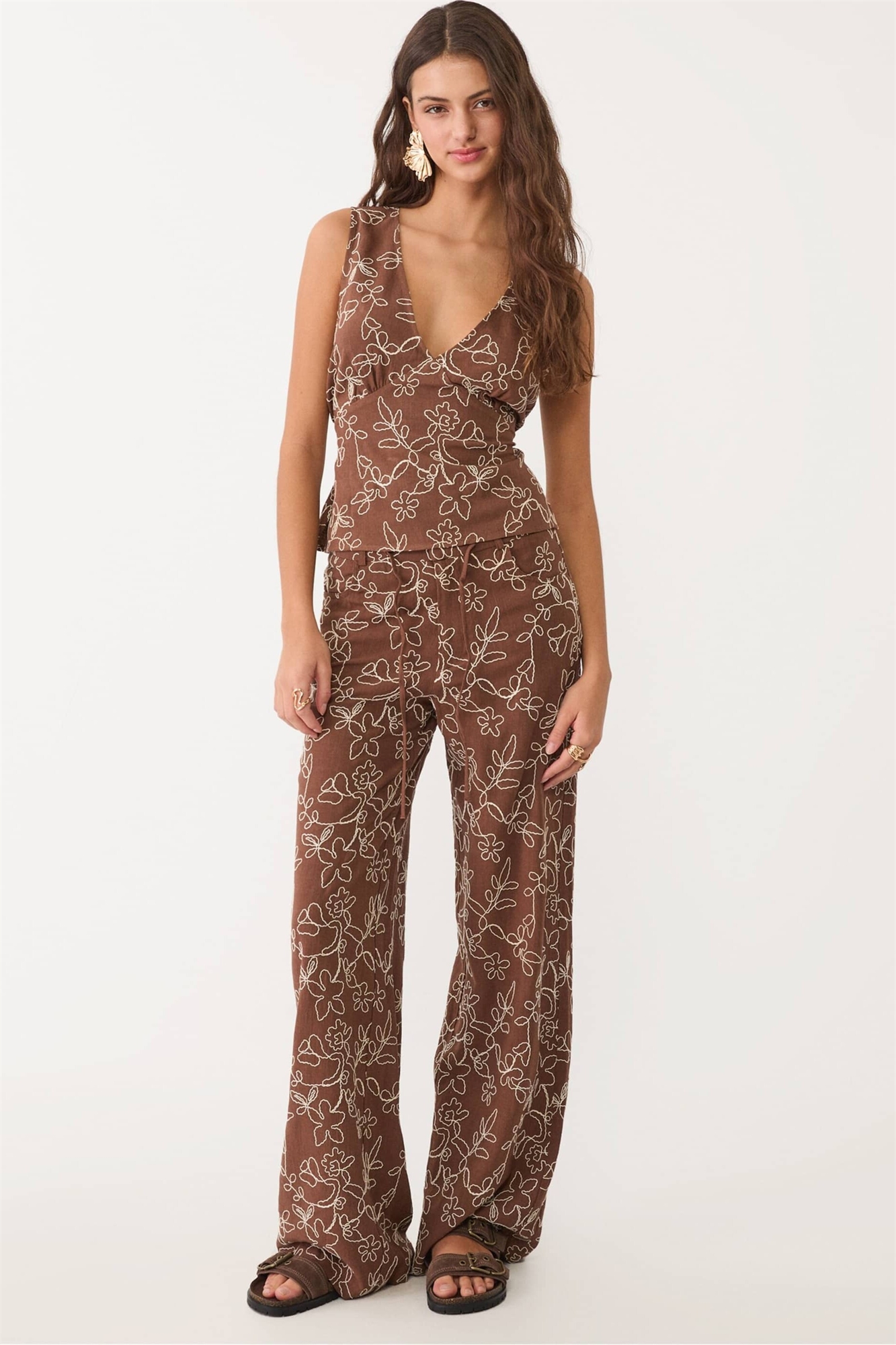 Брюки прямой крой из смешанного льна с вышивкой