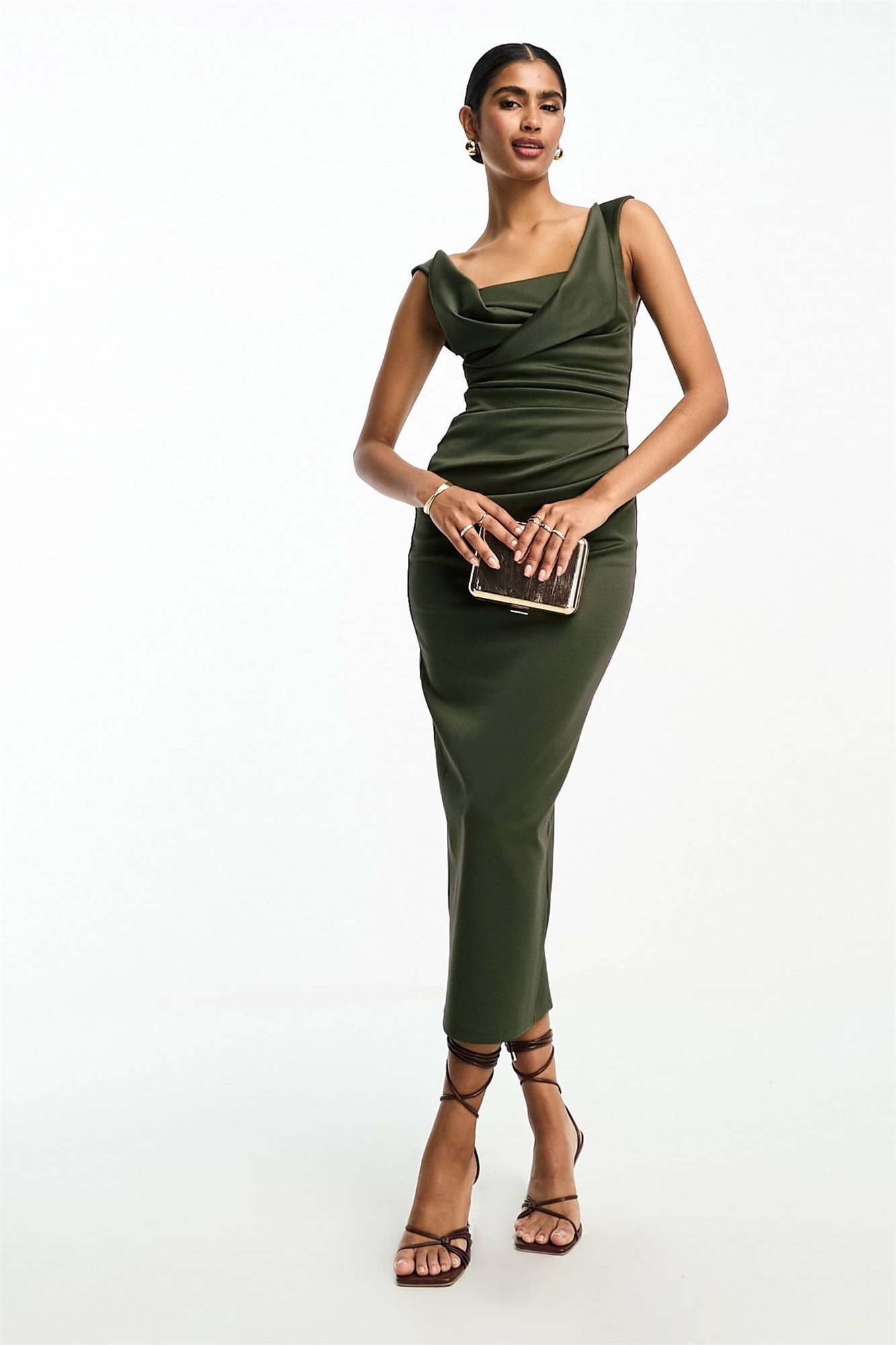 Платье-карандаш средней длины с квадратным вырезом и складками на груди