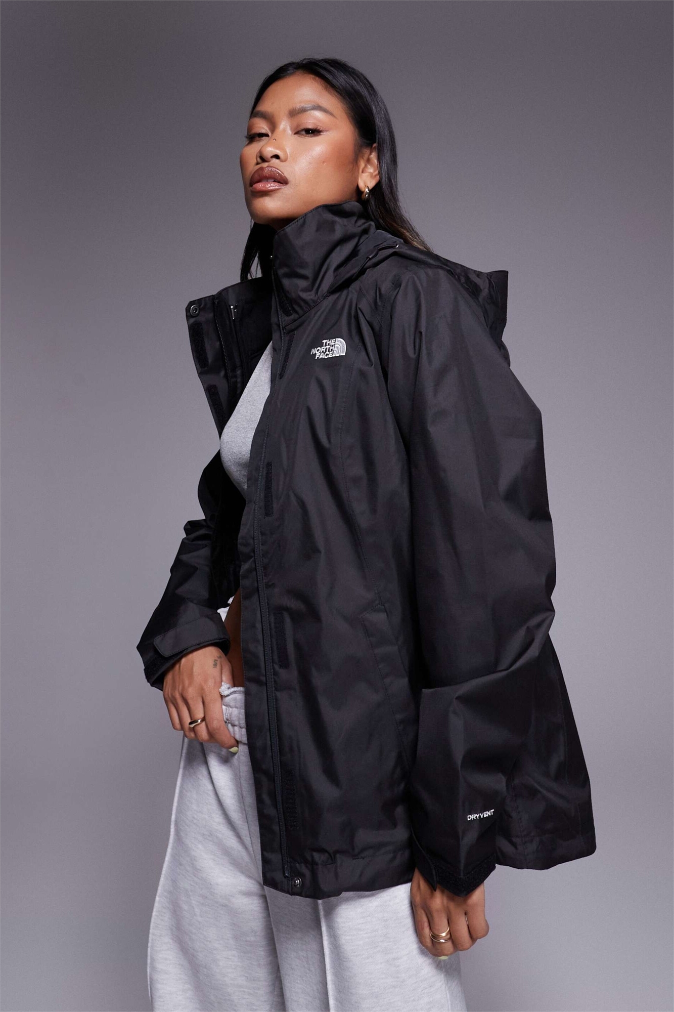 Плотно тканый материал. Прочная водоотталкивающая обработка для дополнительной защиты. Способствует стеканию воды и снега с поверхности. Использует технологию The North Face DryVent. Прочная водоотталкивающая обработка для дополнительной защиты. Водонепроницаемый, ветрозащитный и дышащий. Позволяет выходить водяному пару. Основной материал: 100% полиэстер.