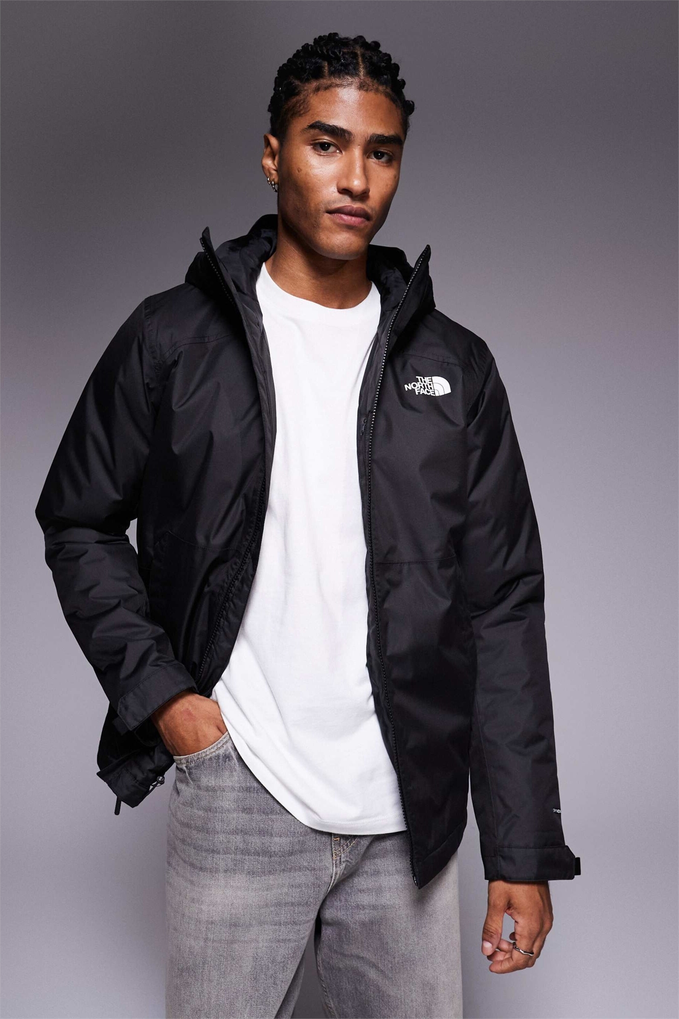 Гладкая тканая ткань Использует технологию The North Face DryVent Прочная водоотталкивающая обработка для дополнительной защиты Водонепроницаемая, ветрозащитная и дышащая Позволяет выходить водяному пару Основной материал: 100% полиэстер.