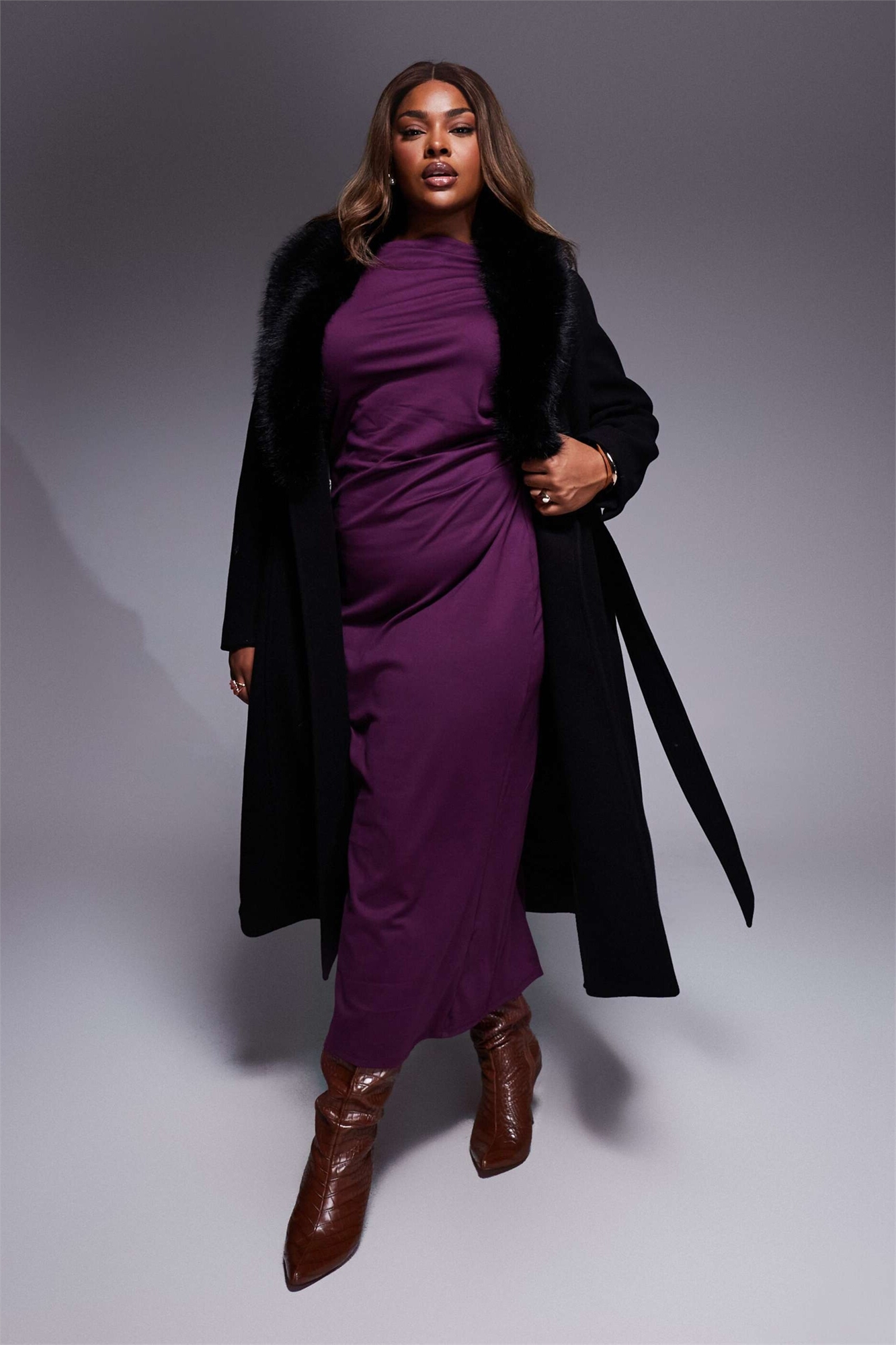 Официальное пальто длинной длины с поясом и съемным воротником-шалью из искусственного меха