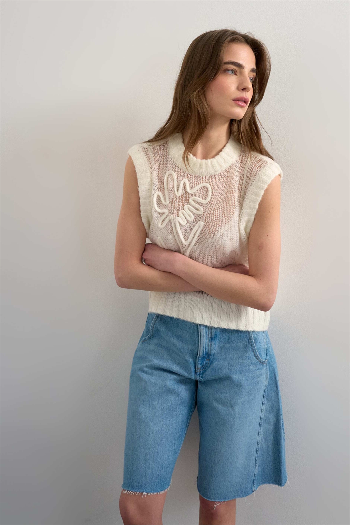 Вязаный прозрачный жилет с цветочной вышивкой