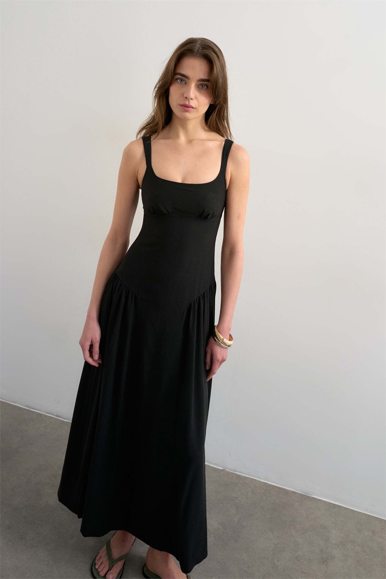 Льняное макси-платье с заниженной талией