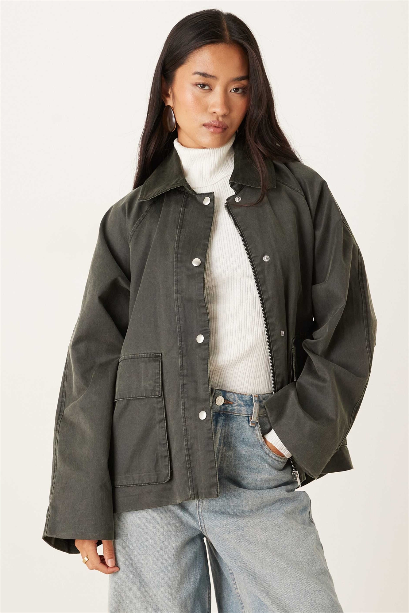 Стеганая куртка-оверсайз из вельвета темно-хаки с контрастным воротником из вельвета
