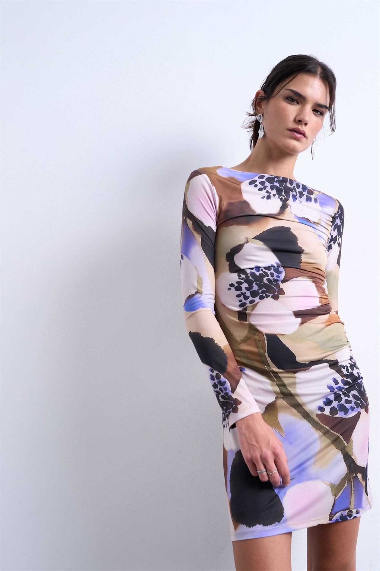 Мини-платье с длинными рукавами, цветочным принтом и сборками по бокам
