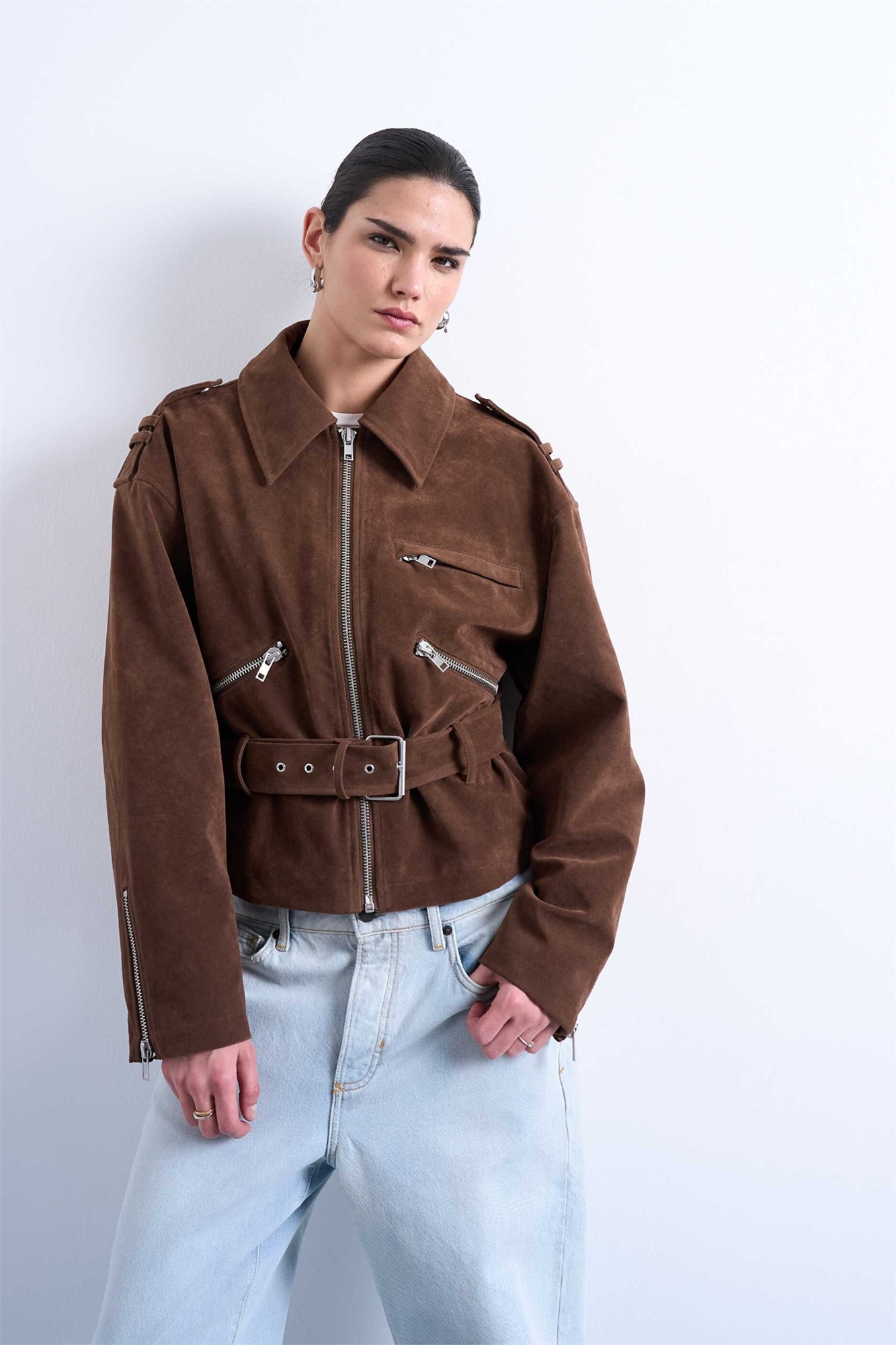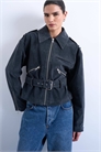 Короткая кожаная куртка в стиле байкера с поясом из искусственной замши