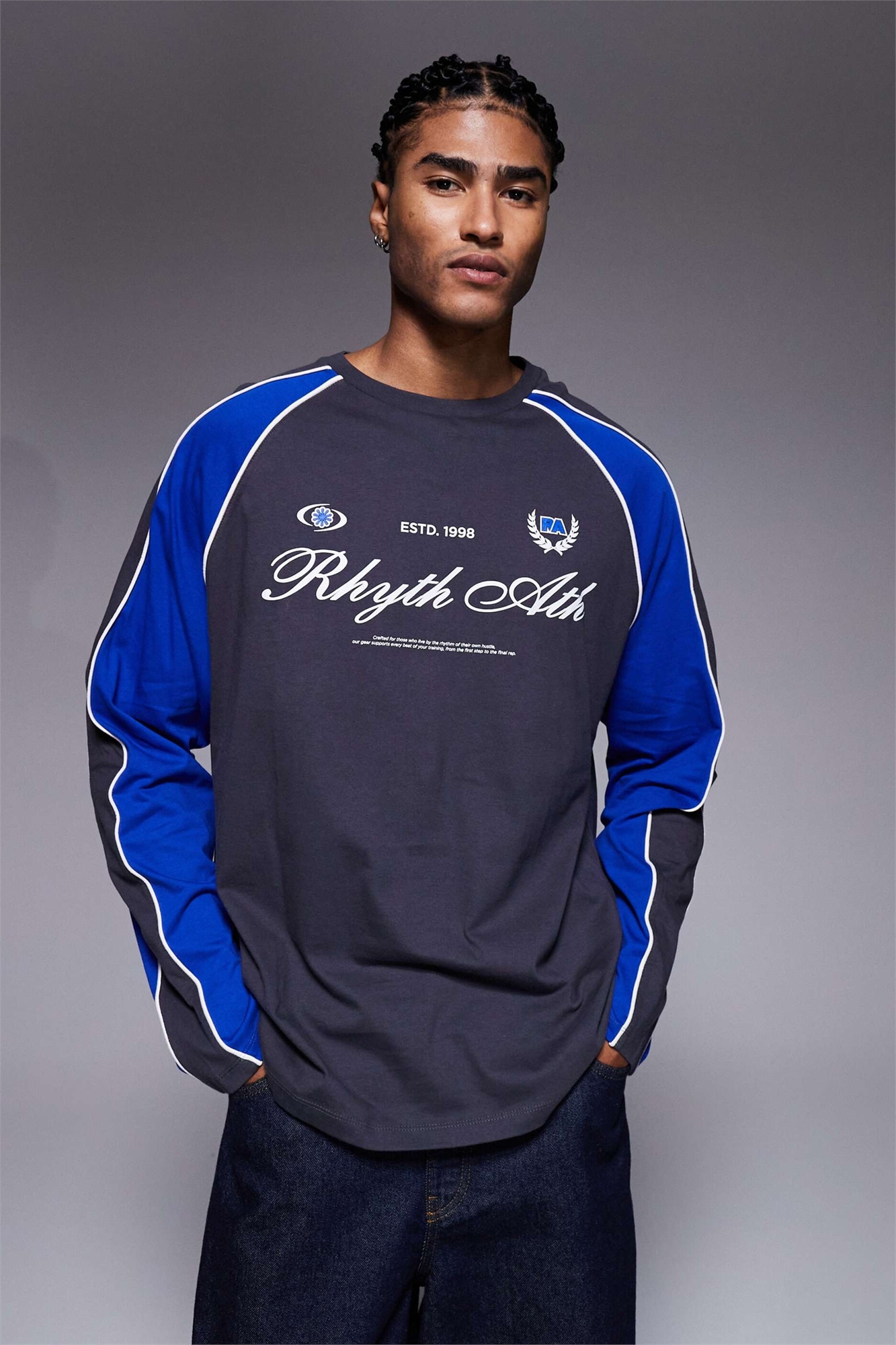 Футболка свободного кроя с длинными рукавами, вставками и спортивным принтом, цвета «антрацит» и синий