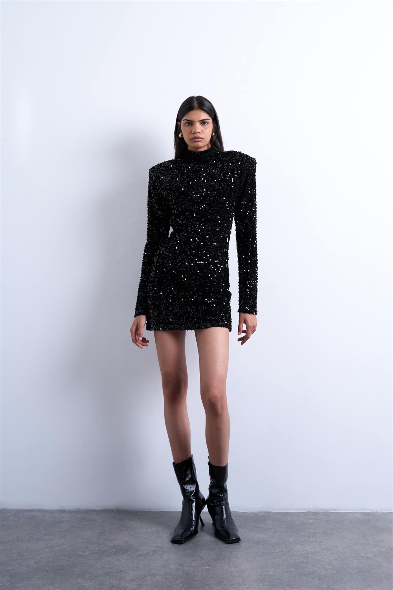 Мини-платье из бархата с длинными рукавами, пайетками и плечевыми накладками