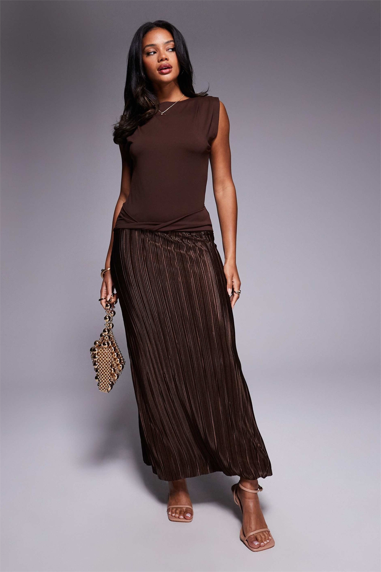 Макси-платье с гибридным плиссированным узором и закрученными деталями