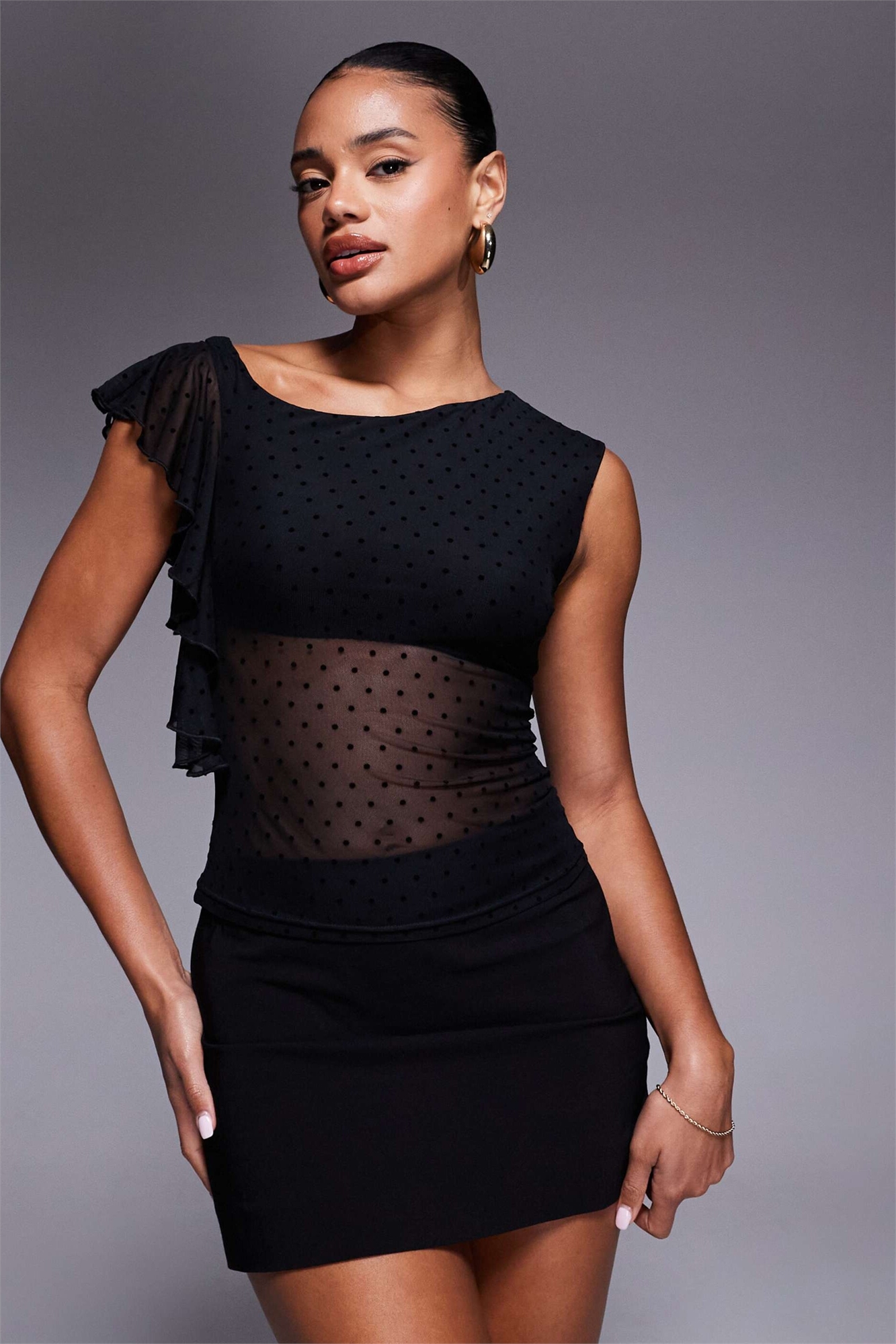Топ из сетчатой ткани в горошек с асимметричными оборками на плечах от Cicero