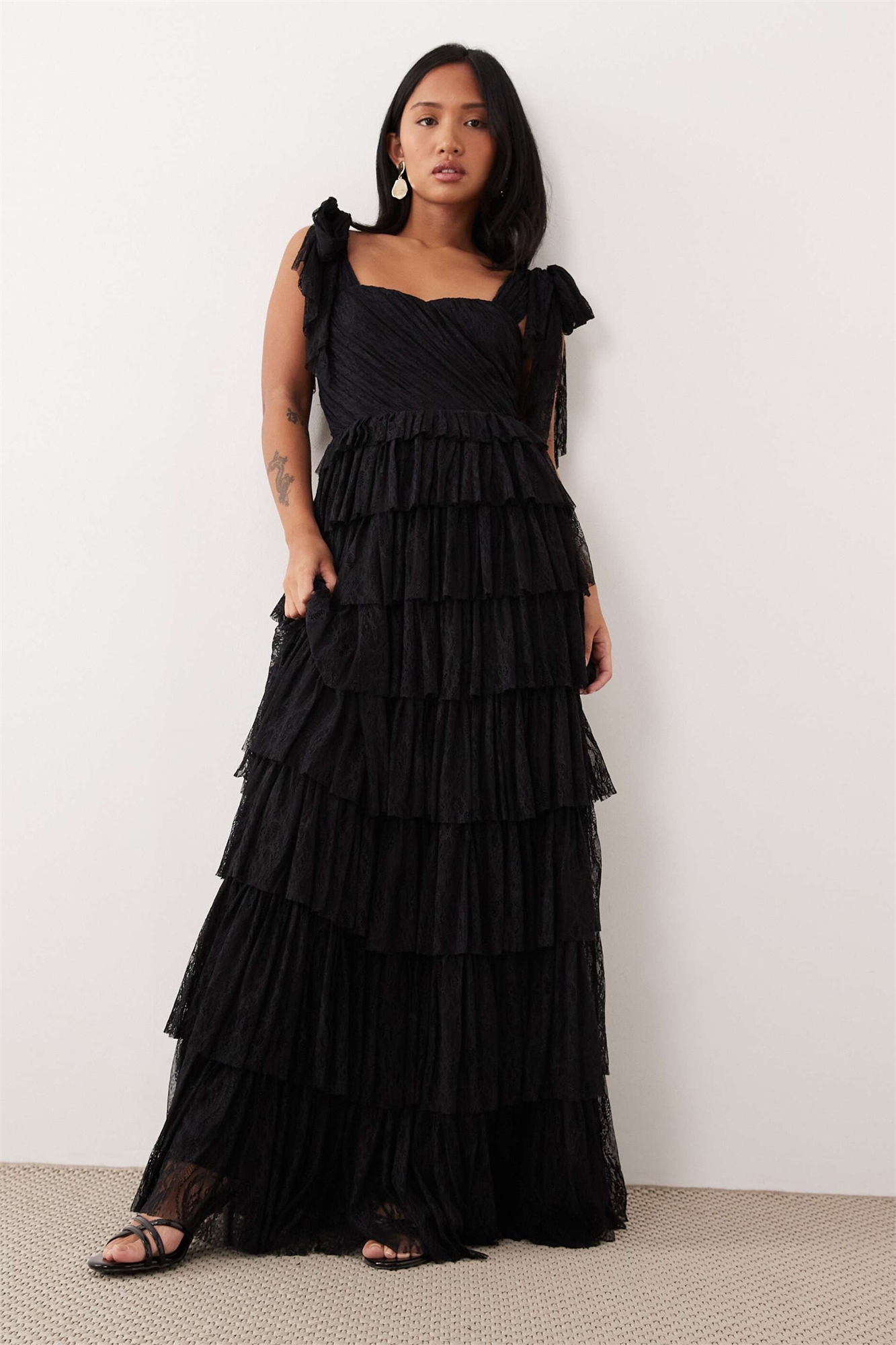 Макси-платье с кружевным бантом на плече и многослойным силуэтом