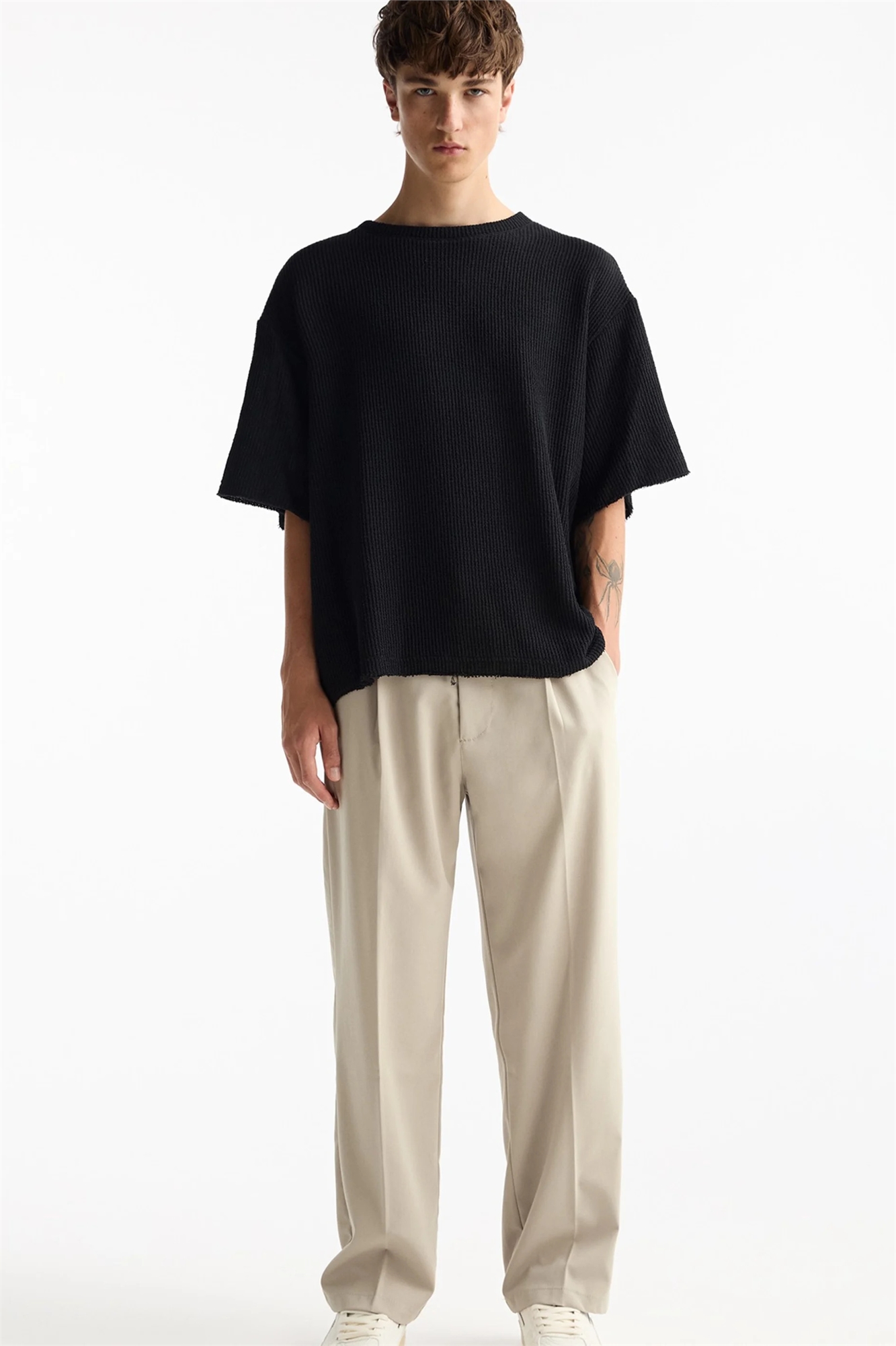 Эластичная ткань полотняного переплетения. Основной состав: 72% полиэстер, 25% вискоза, 3% эластан.