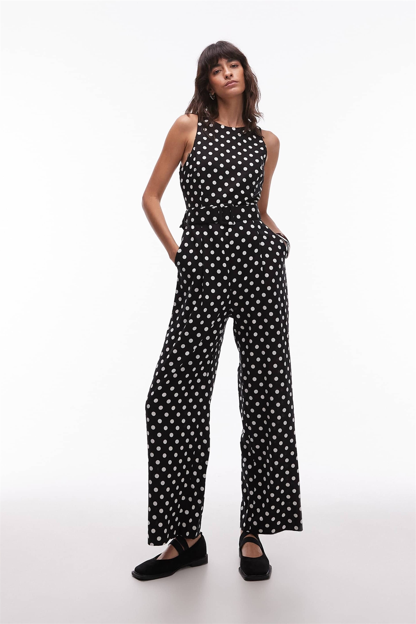 Комбинезон прямого кроя в горошек с поясом, подчеркивающим талию