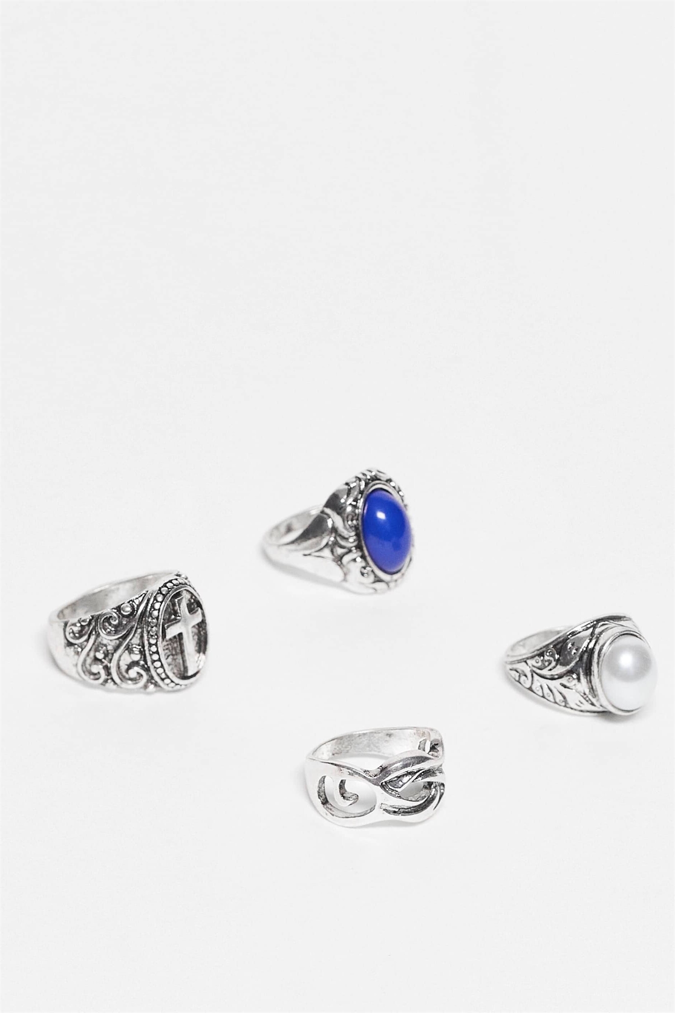 Унисекс набор из 4 колец в стиле гранж с искусственным голубым камнем из полированного серебра