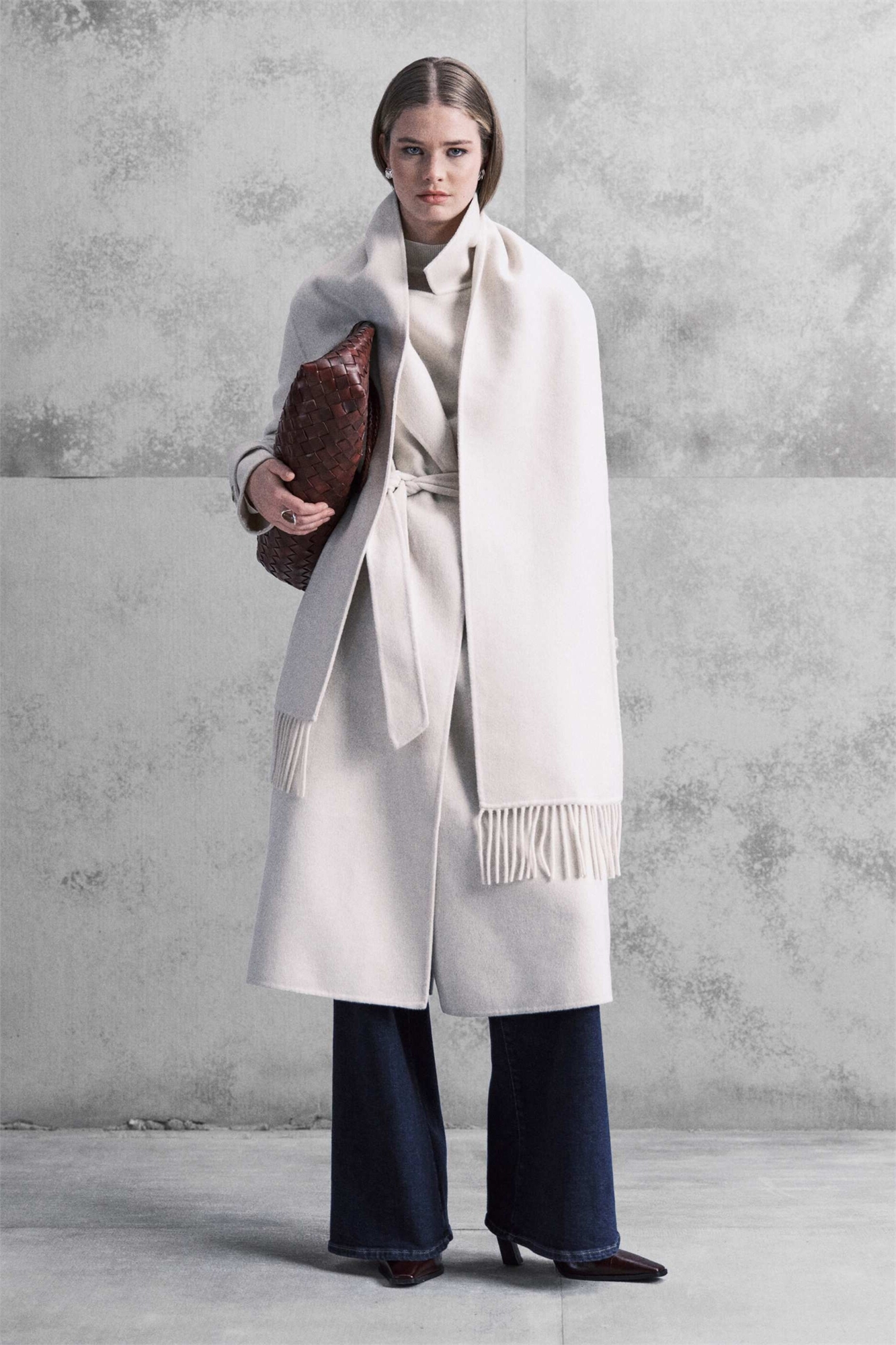 Формальное пальто с поясом и шарфом с кисточками из шерсти кремового цвета