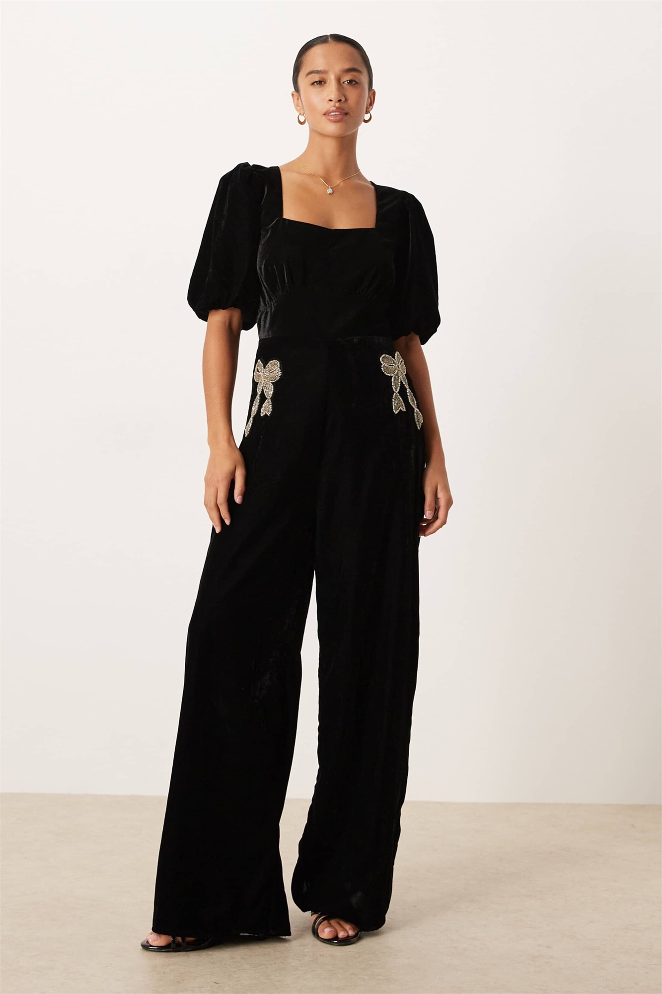Бархатный комбинезон с квадратным вырезом и украшенными бантами
