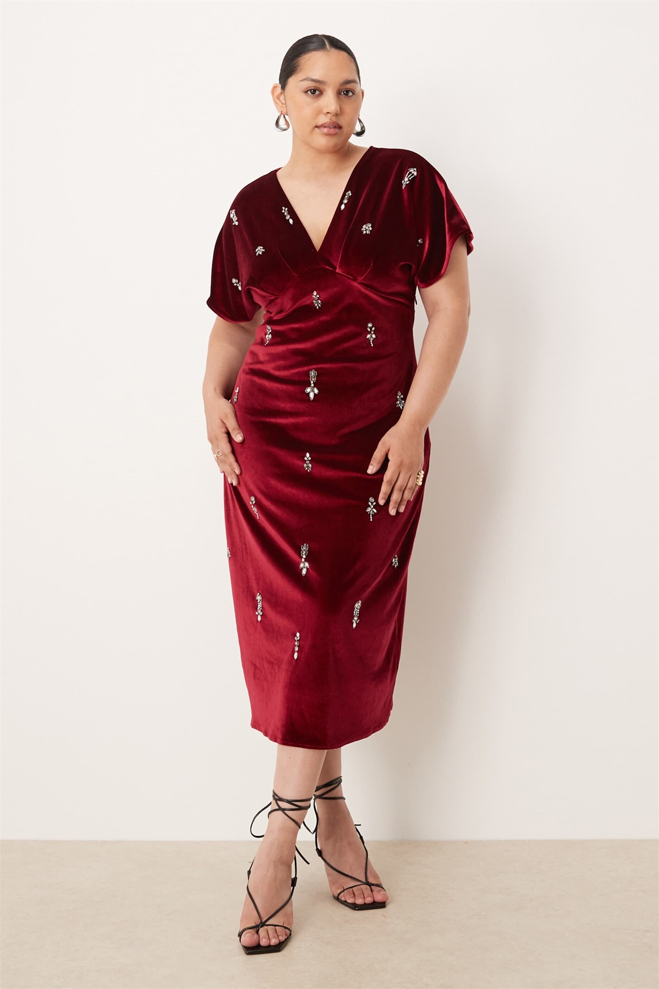 Бархатное платье средней длины с V-образным вырезом и декоративными элементами