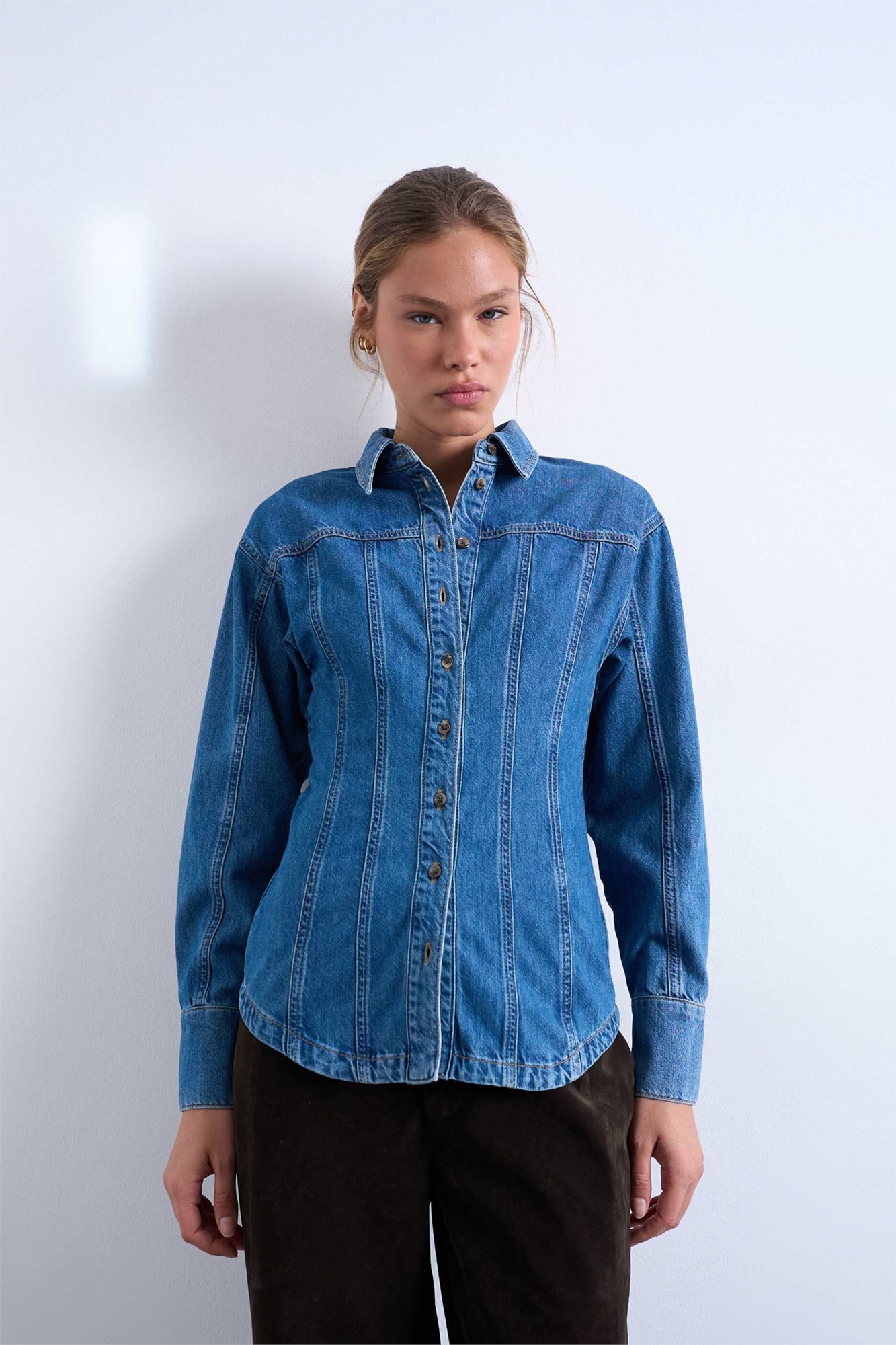 Джинсовая рубашка с затягивающимся поясом и декоративными швами