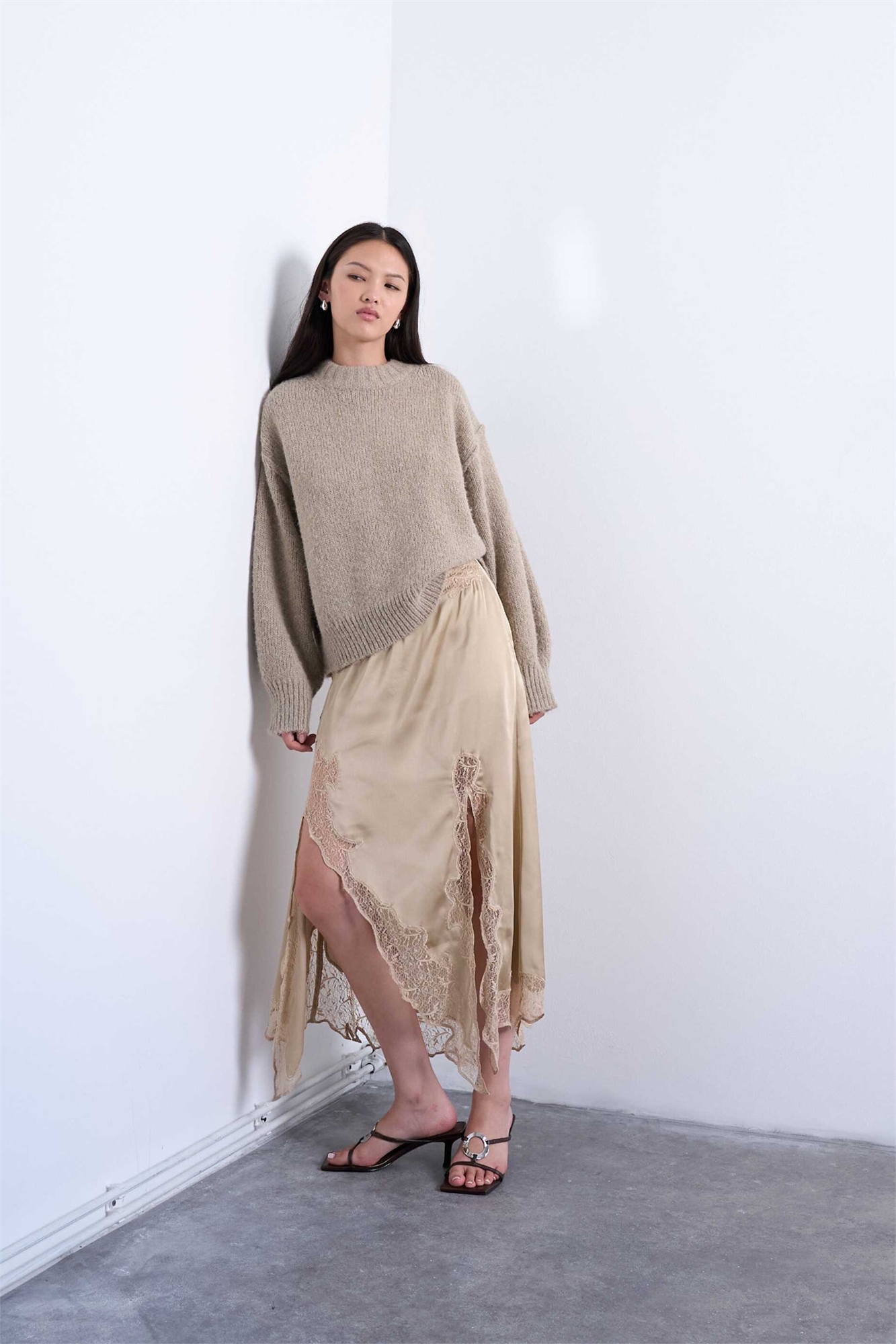 Юбка средней длины с волнистым краем из атласа и кружева