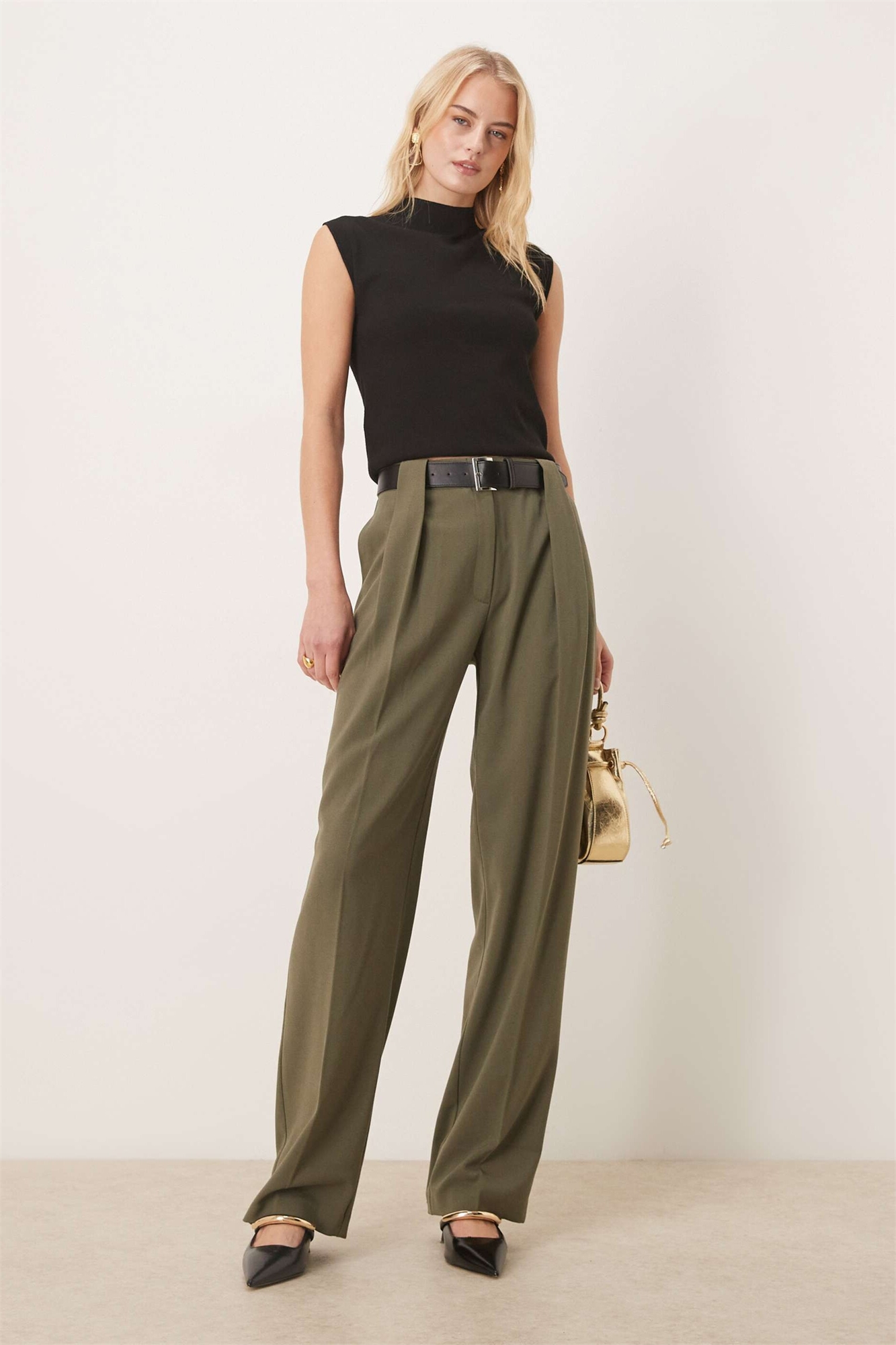 Высокие брюки с зауженными брючинами и поясом на высокой талии