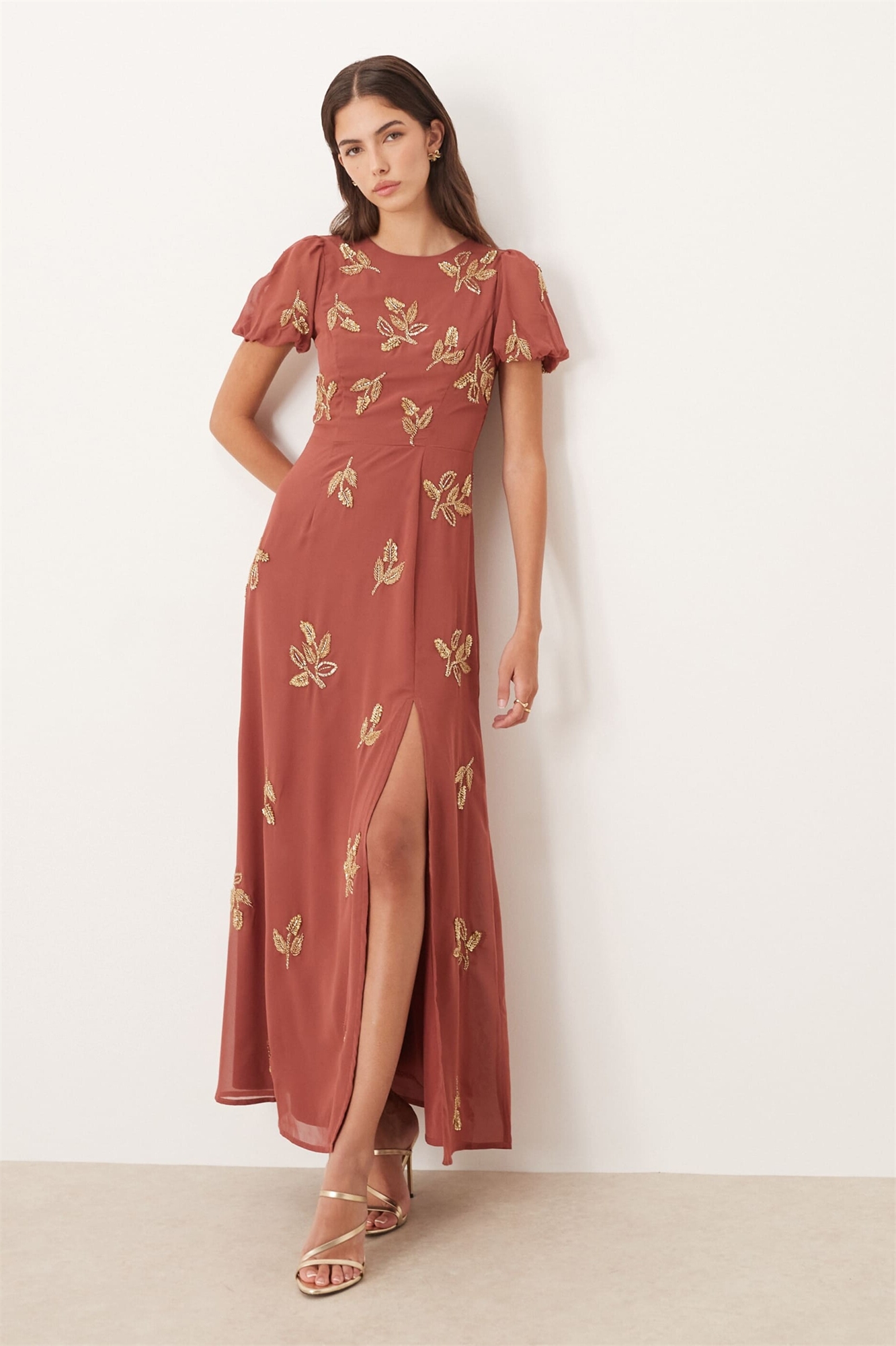 Макси-платье с короткими рукавами, открытой спиной и декоративными элементами