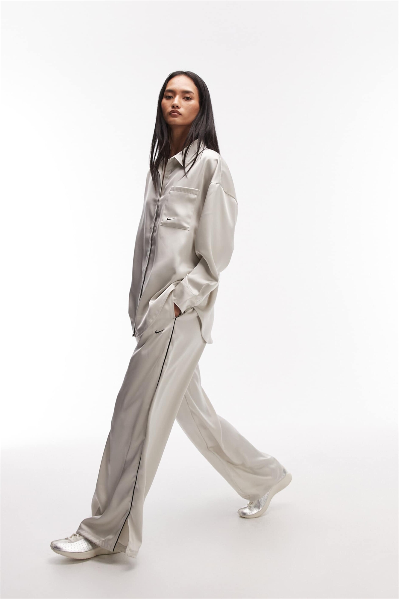 Брюки из атласа с широкими брючинами и декором на поясе