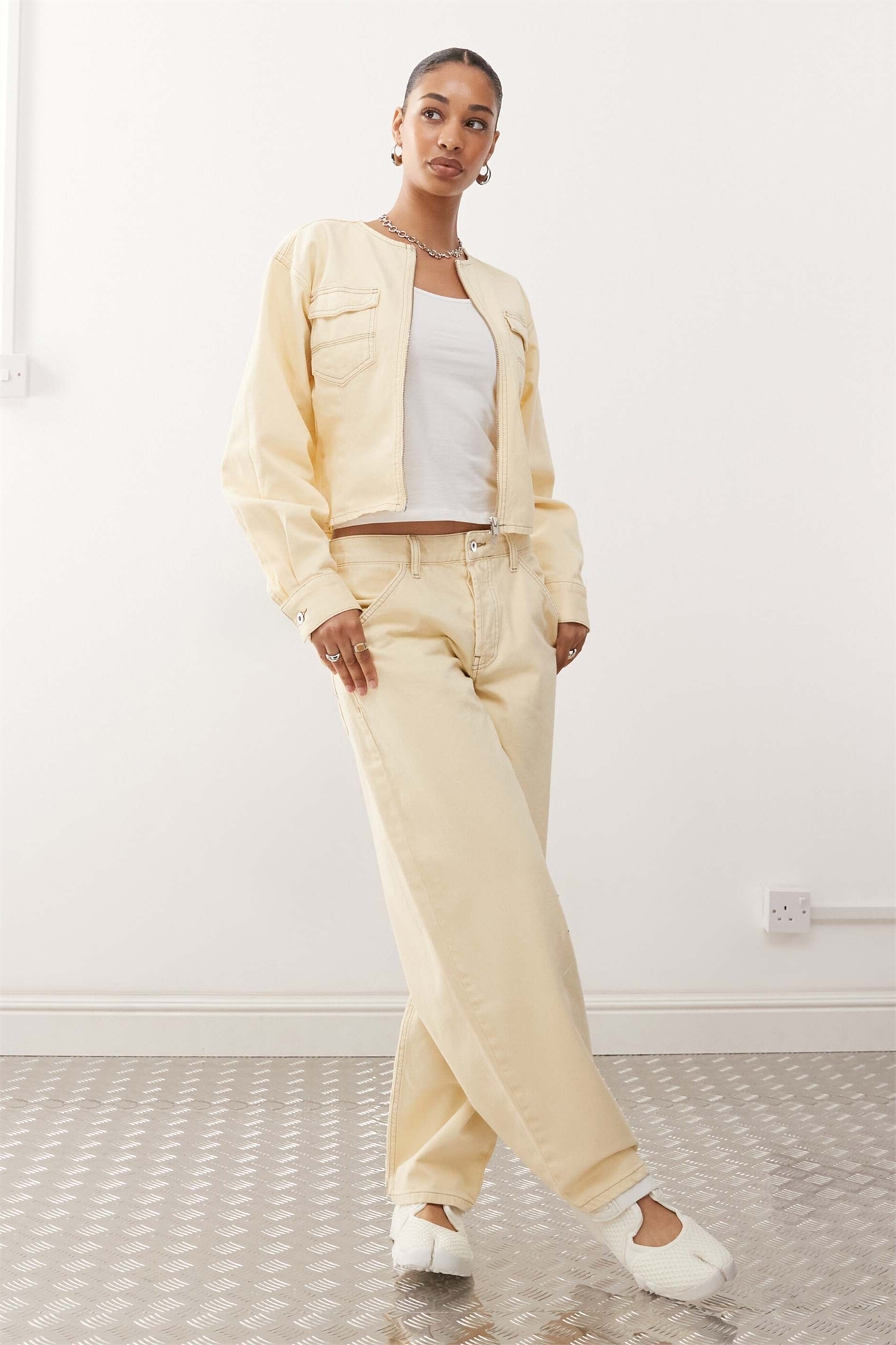 Джинсовая приталенная куртка с пряжкой на спине цвета сливочного масла
