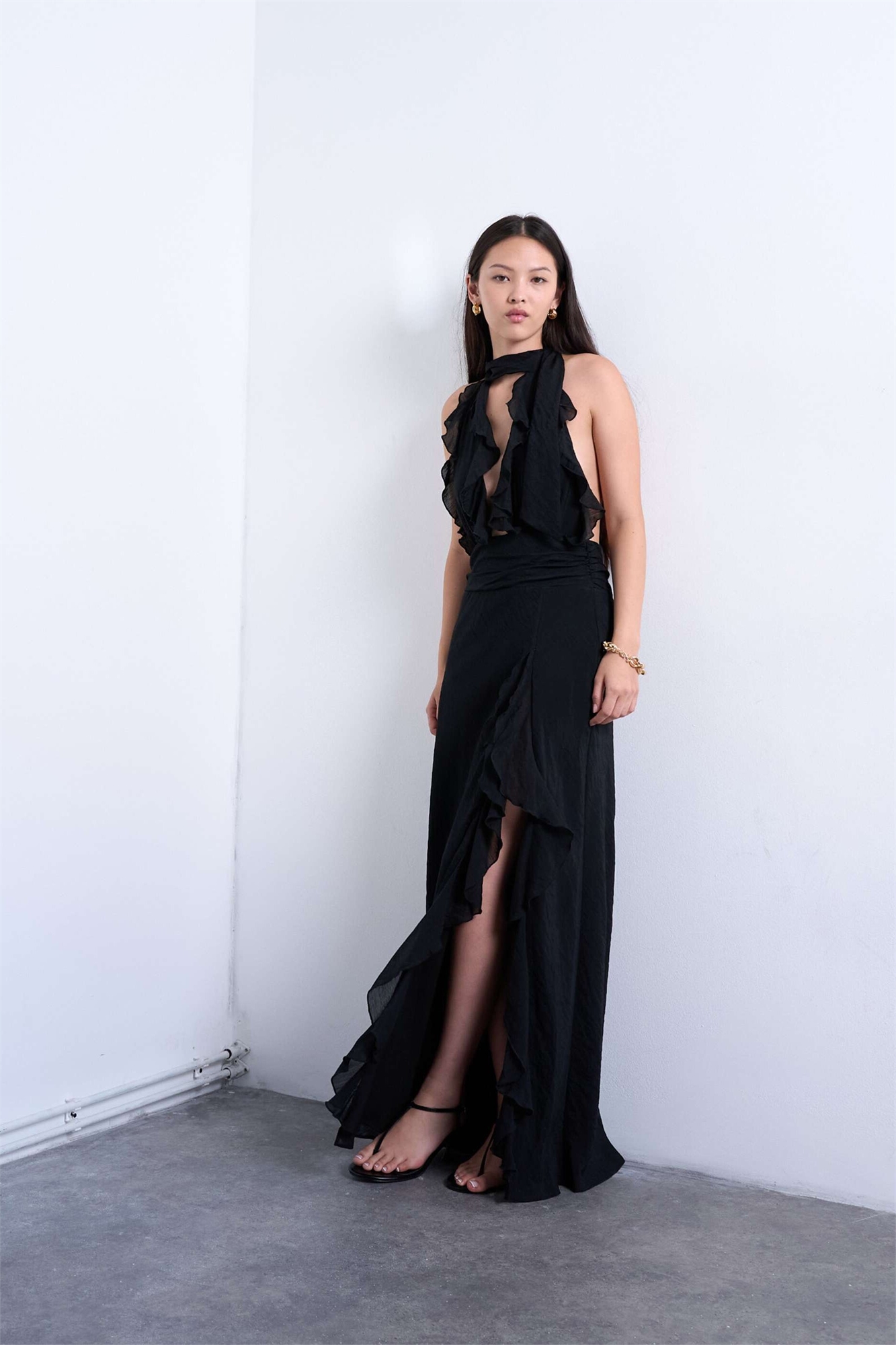Макси-платье с глубоким вырезом и оборками