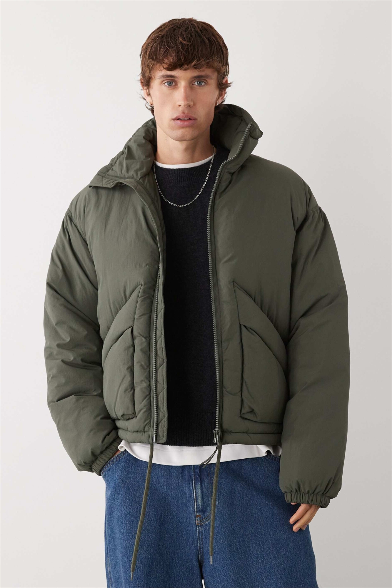 Пуховик с высоким воротником темно-хаки