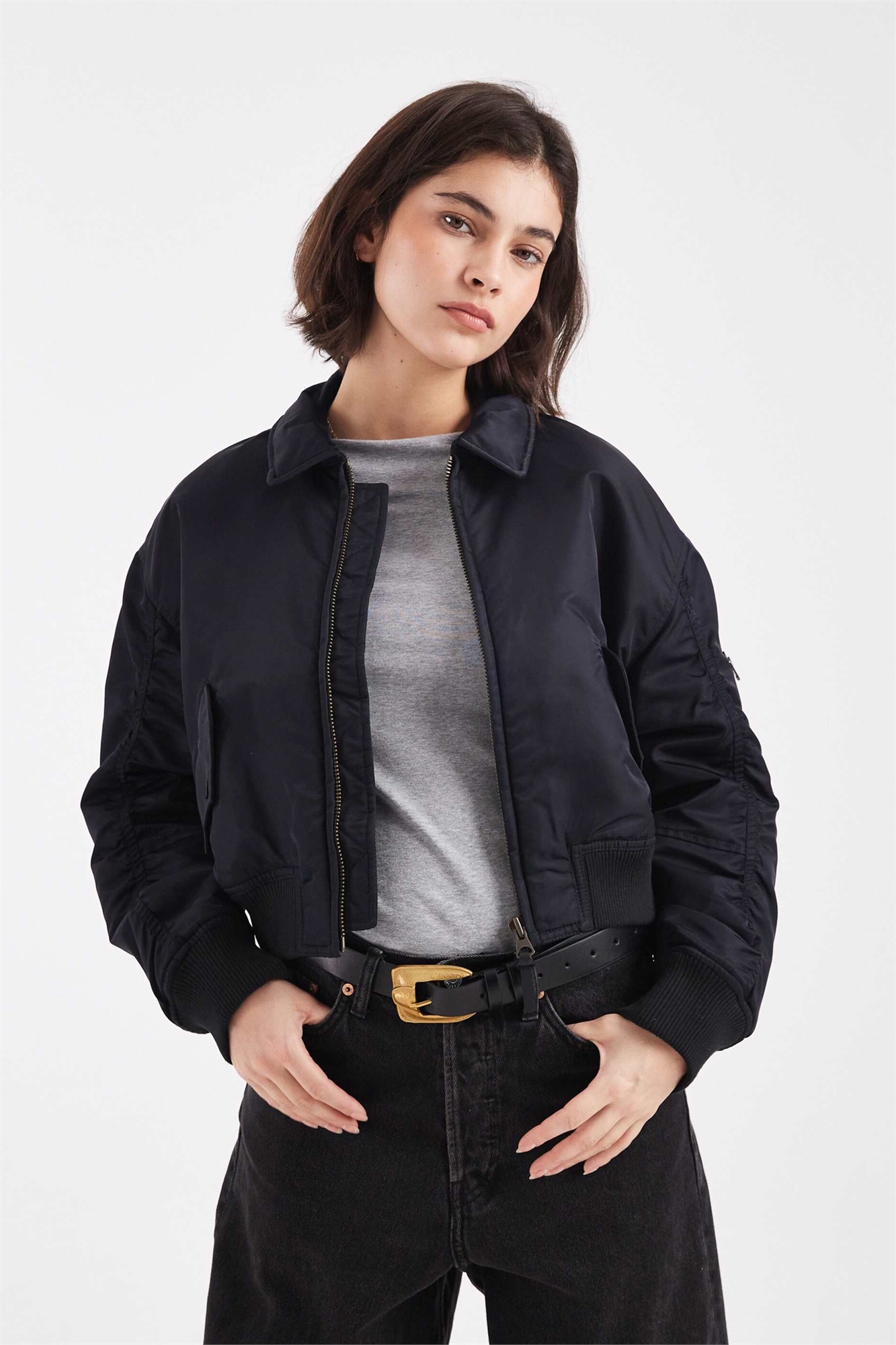 Бомбер из нейлона с черными рукавами с рюшами