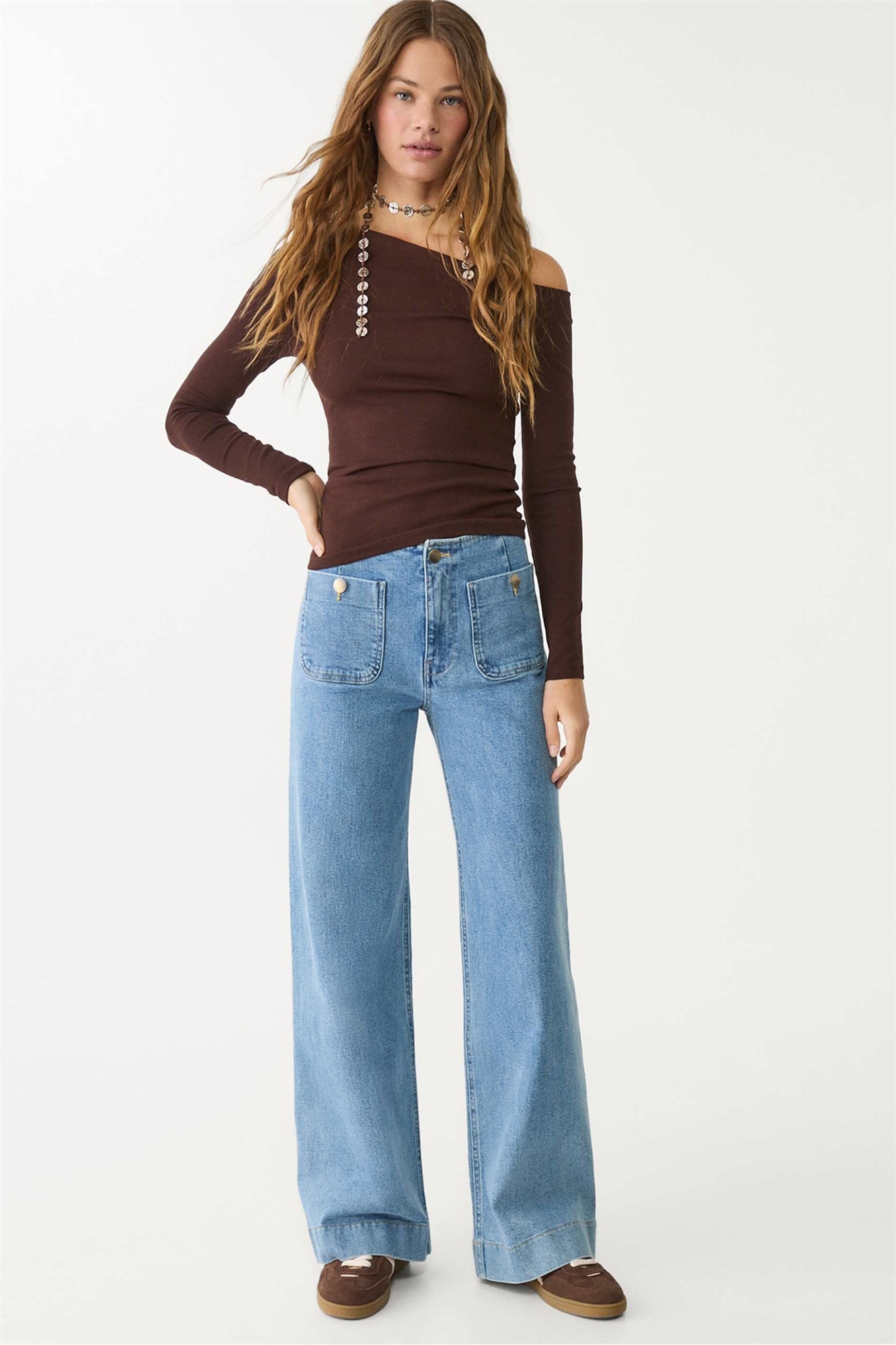Неэластичный деним: светло-голубой оттенок Основной материал: 99% хлопок, 1% эластан.