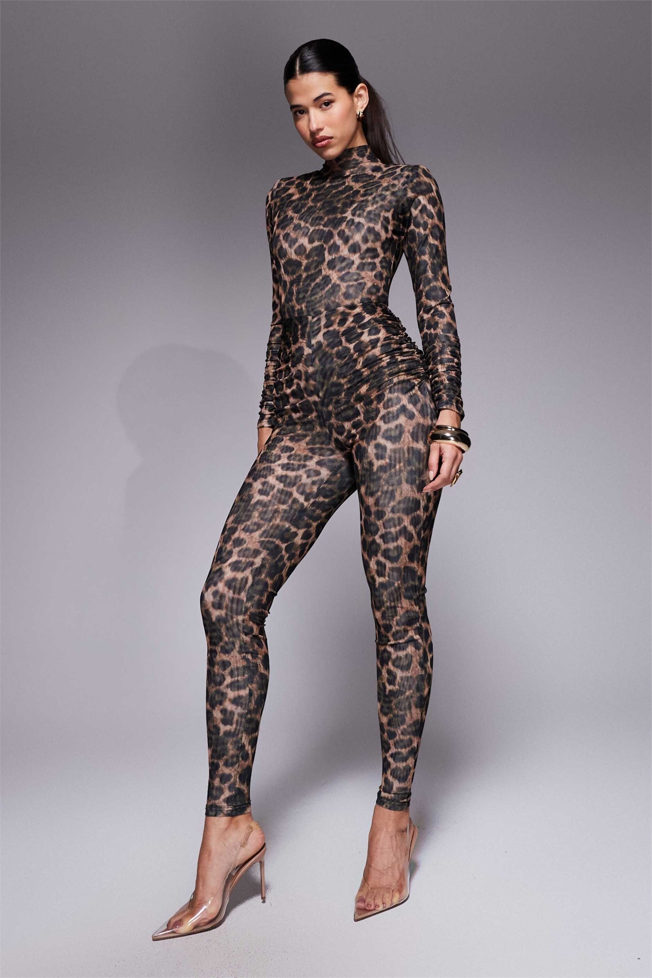 Комбинезон с высоким воротником и длинными рукавами из скульптурной сетки с леопардовым принтом