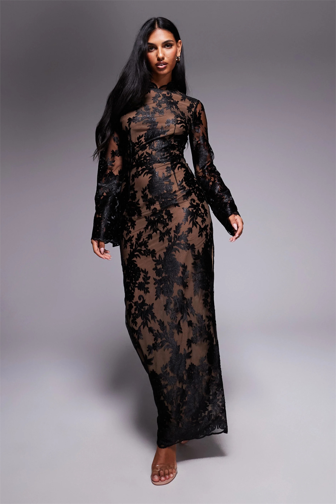 Черное макси-платье с длинными рукавами, расклешенным силуэтом и цветочным кружевом