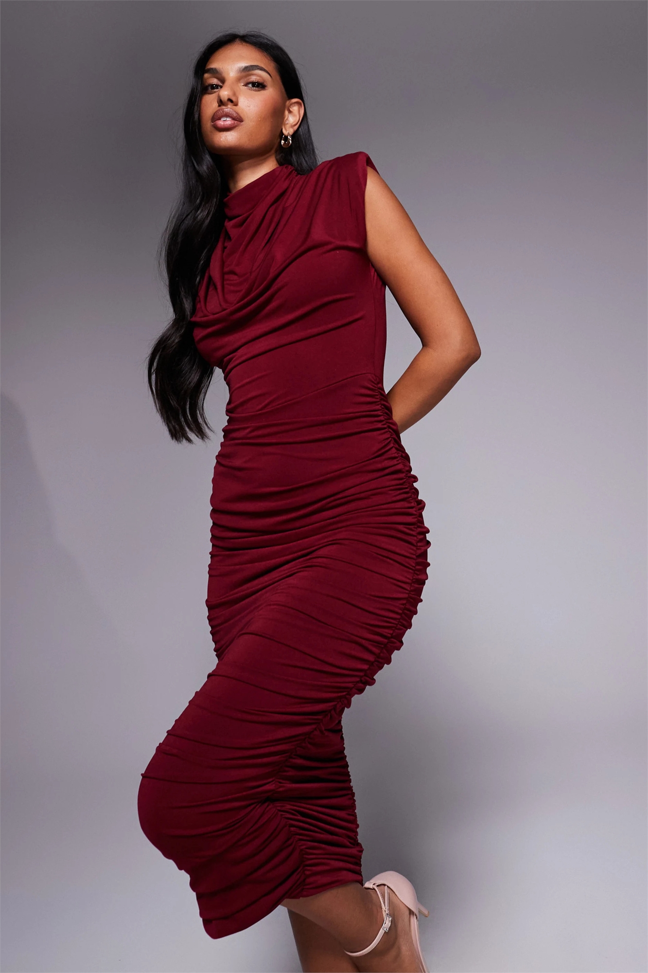 Платье средней длины с высоким воротником и накладными плечами